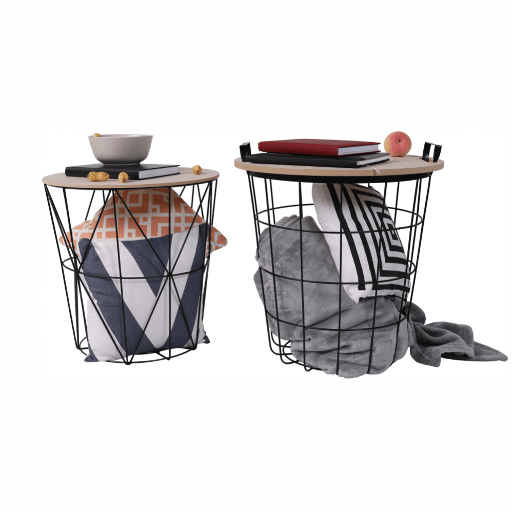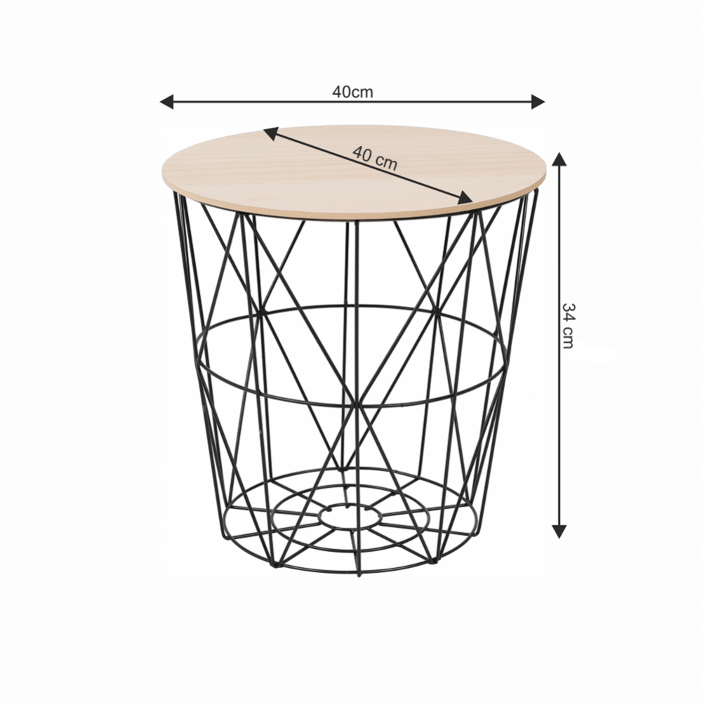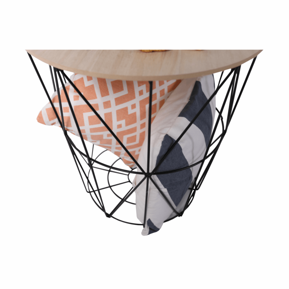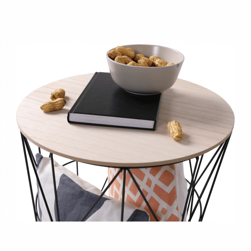 Hlavním pilířem je černá kovová konstrukce, která vytváří oporu pro vrchní část vyrobenou z MDF v přírodním provedení. Vrchní deska je snímatelná, takže stolek poskytuje dostatek úložného prostoru.