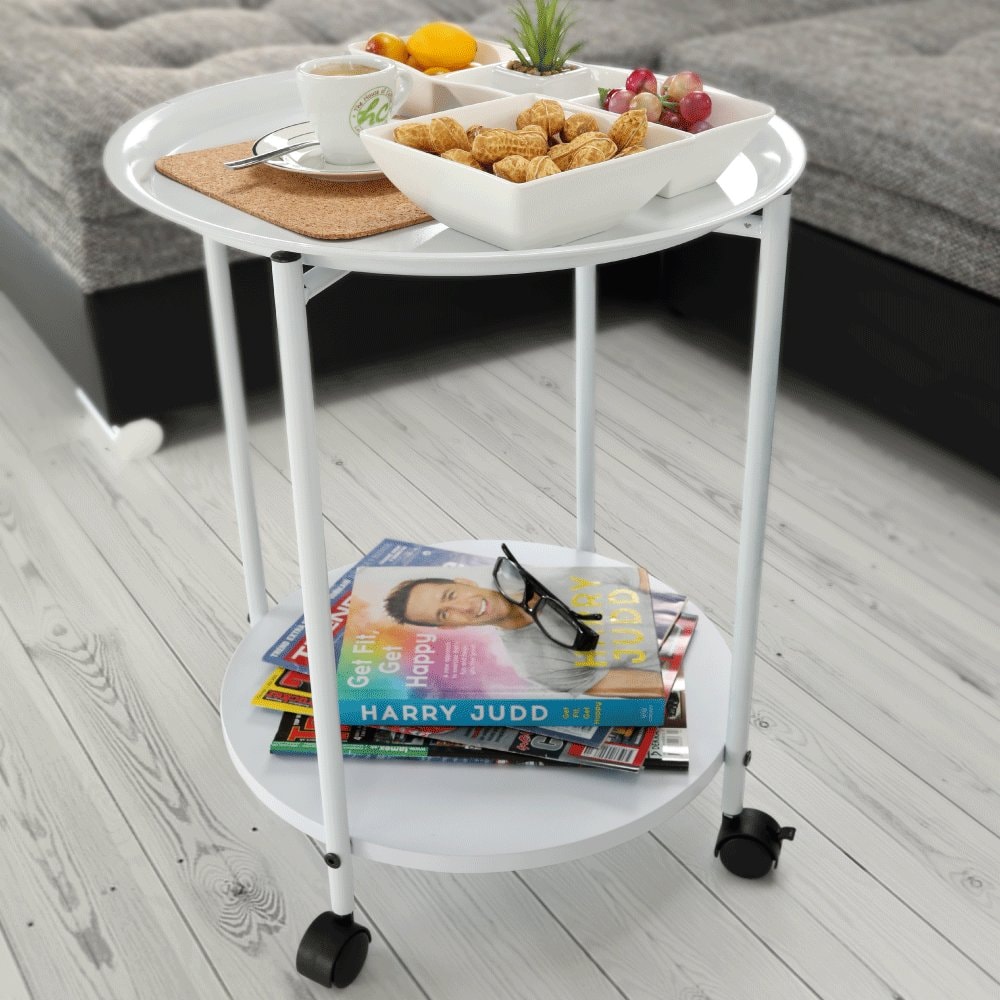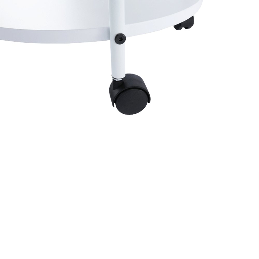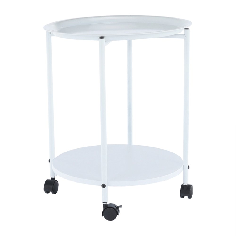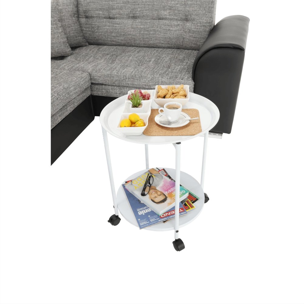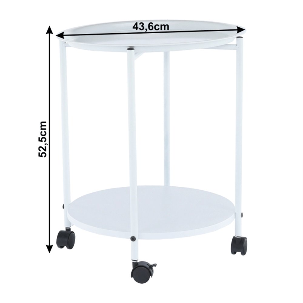 Bílý příruční stolek DERIN na kolečkách. Materiál MDF / kov. Rozměry (priemerxV): 43,6x52,5 cm Tloušťka materiálu: 15 mm