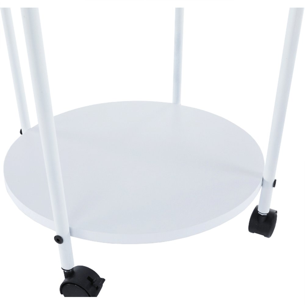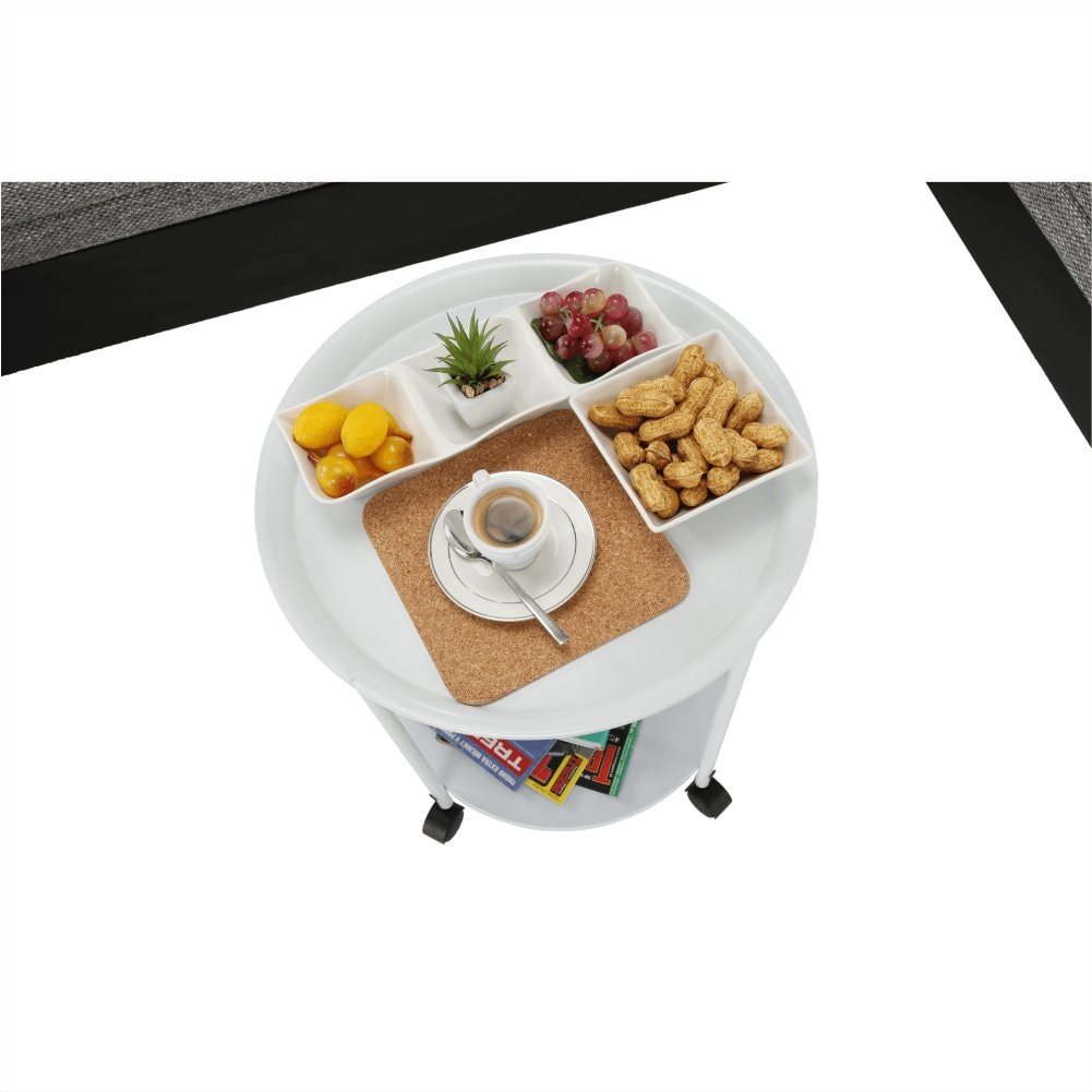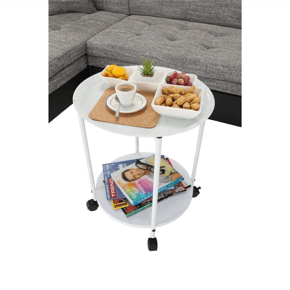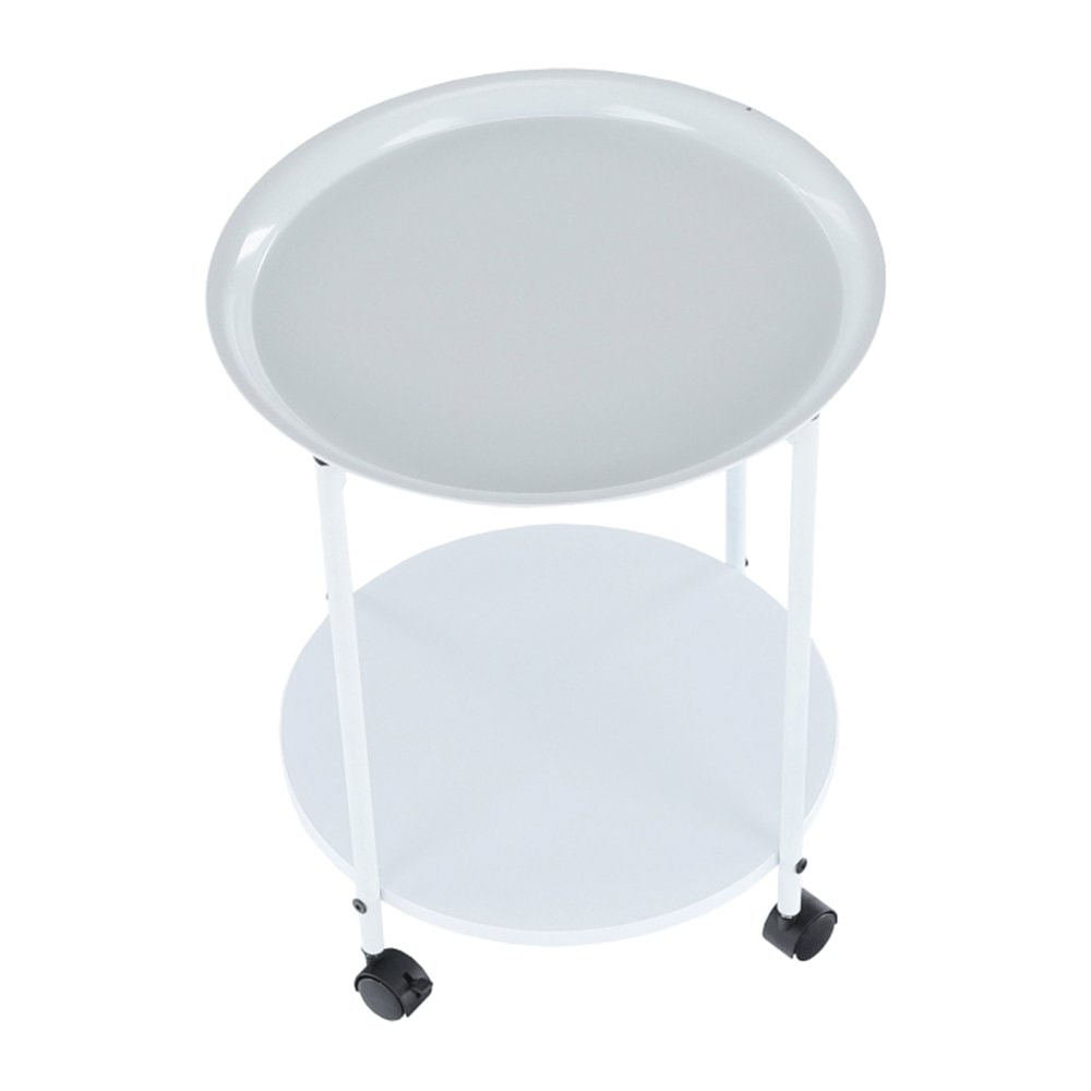 Bílý příruční stolek DERIN na kolečkách. Materiál MDF / kov. Rozměry (priemerxV): 43,6x52,5 cm Tloušťka materiálu: 15 mm