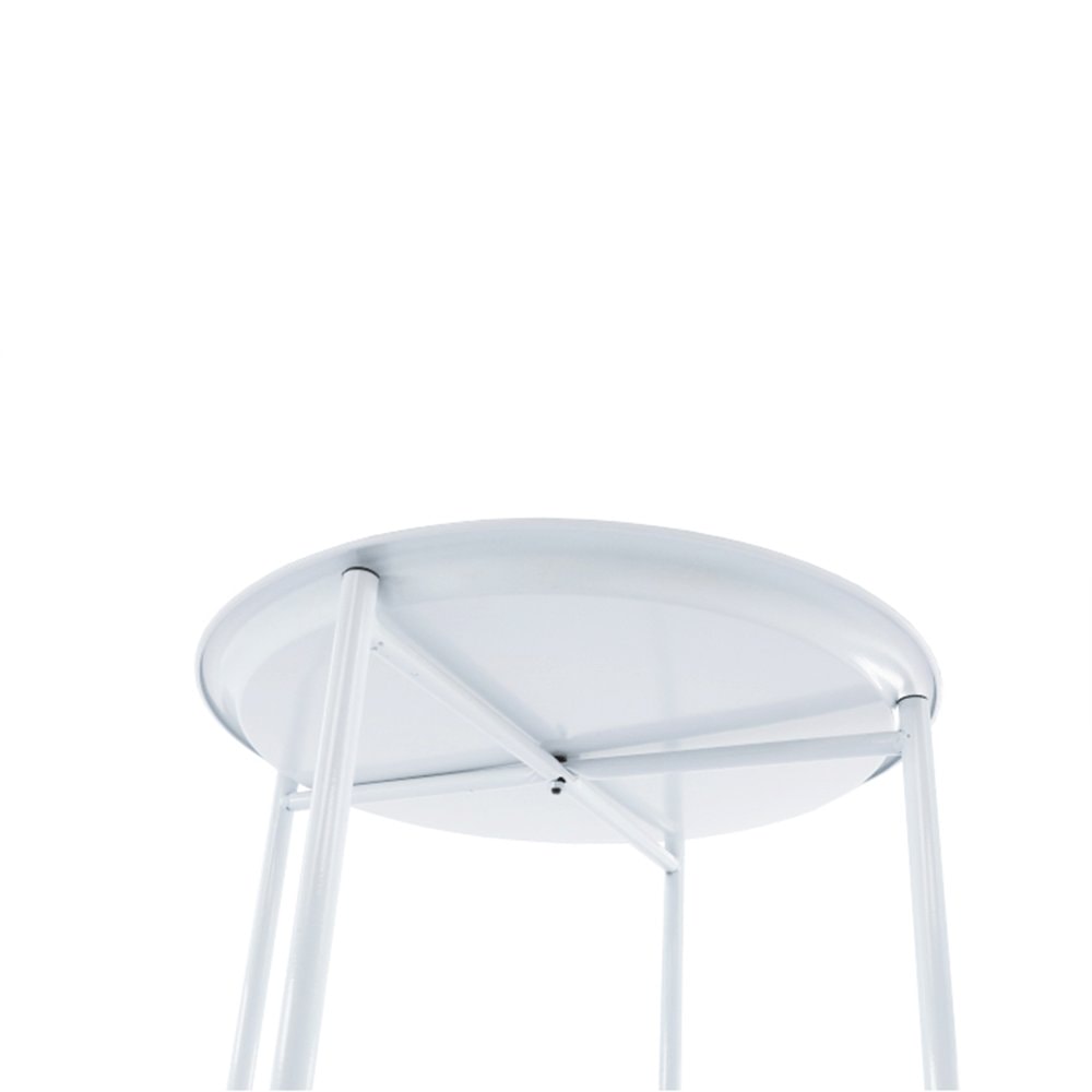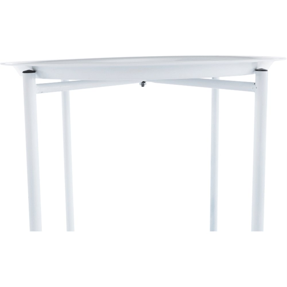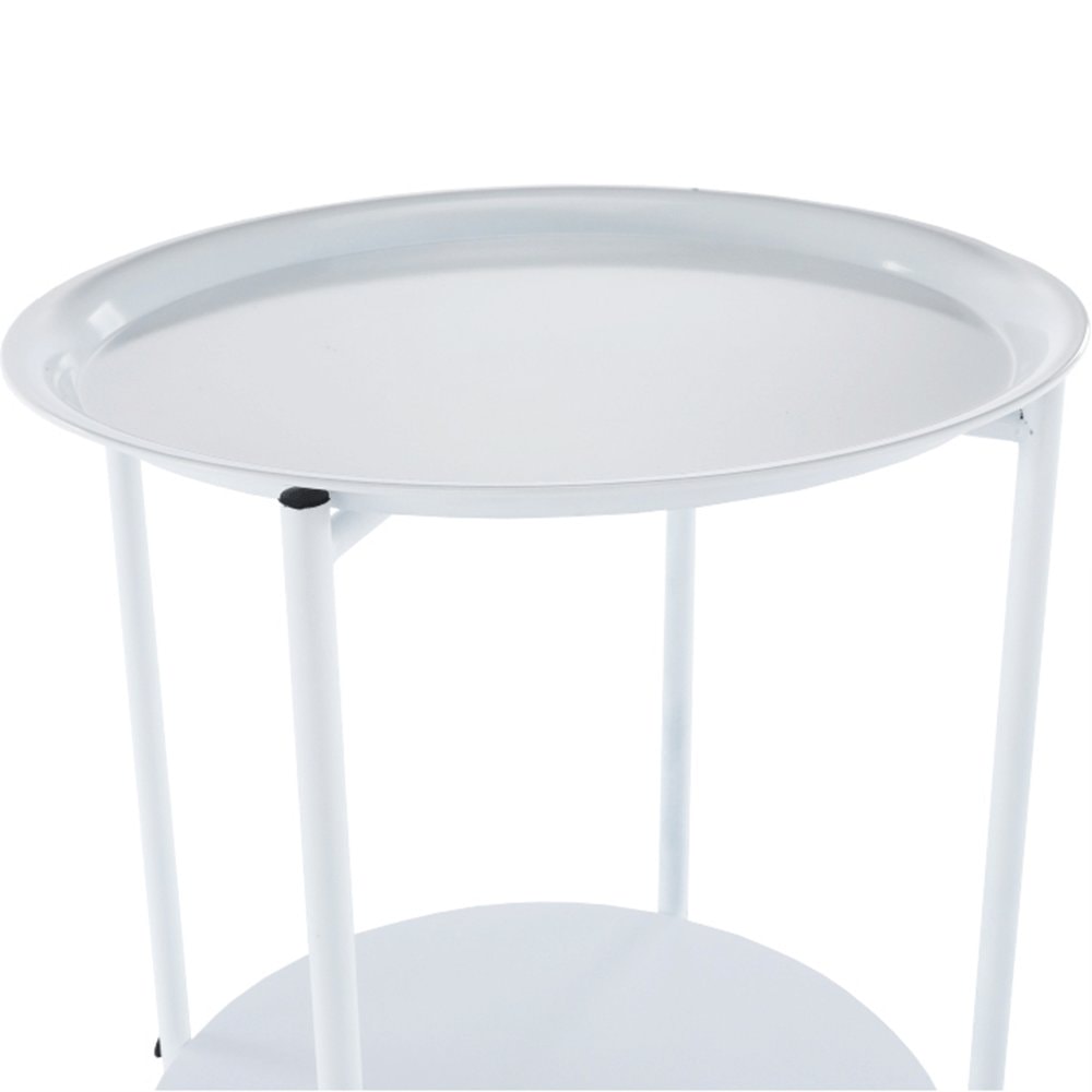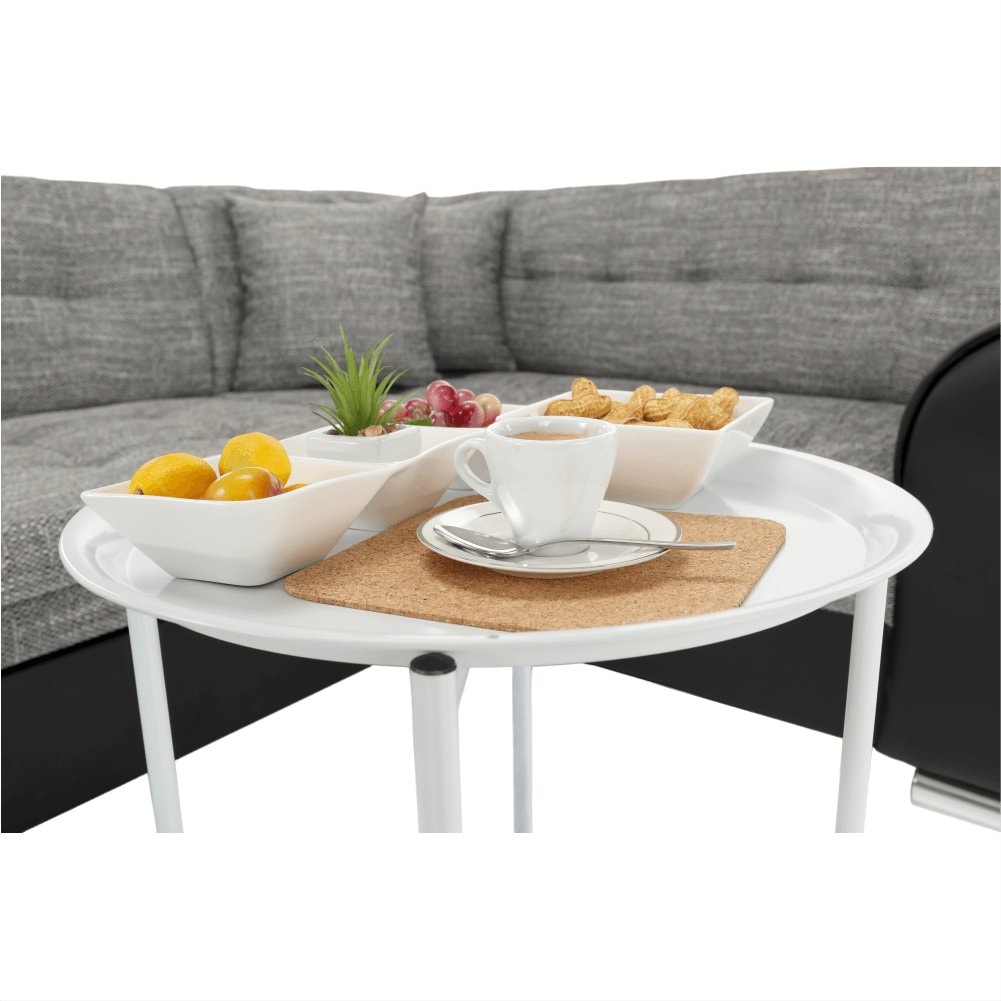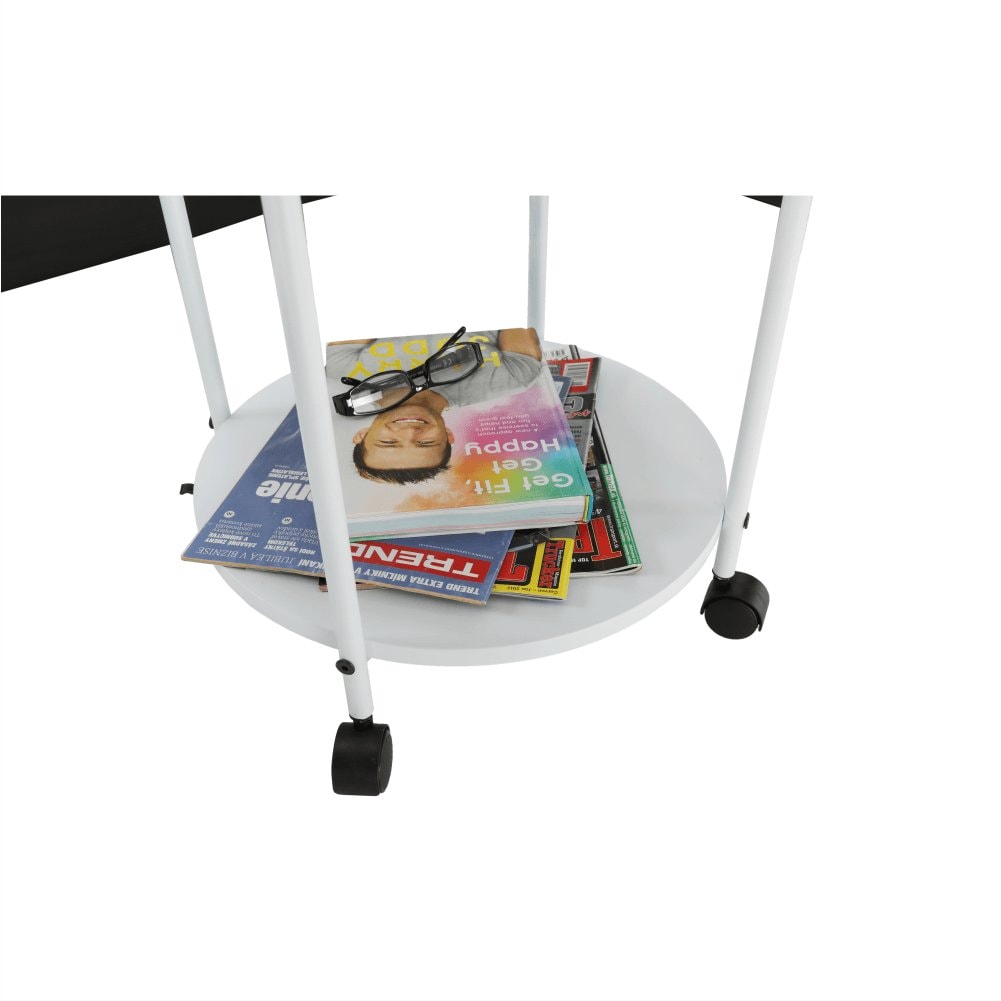 Bílý příruční stolek DERIN na kolečkách. Materiál MDF / kov. Rozměry (priemerxV): 43,6x52,5 cm Tloušťka materiálu: 15 mm