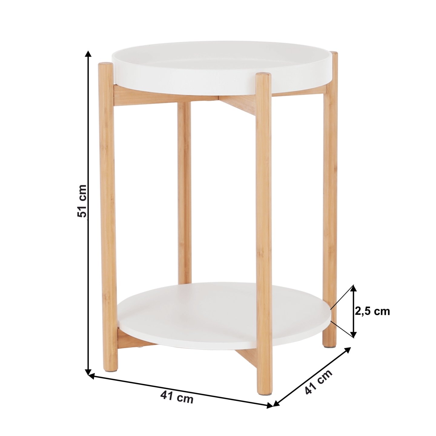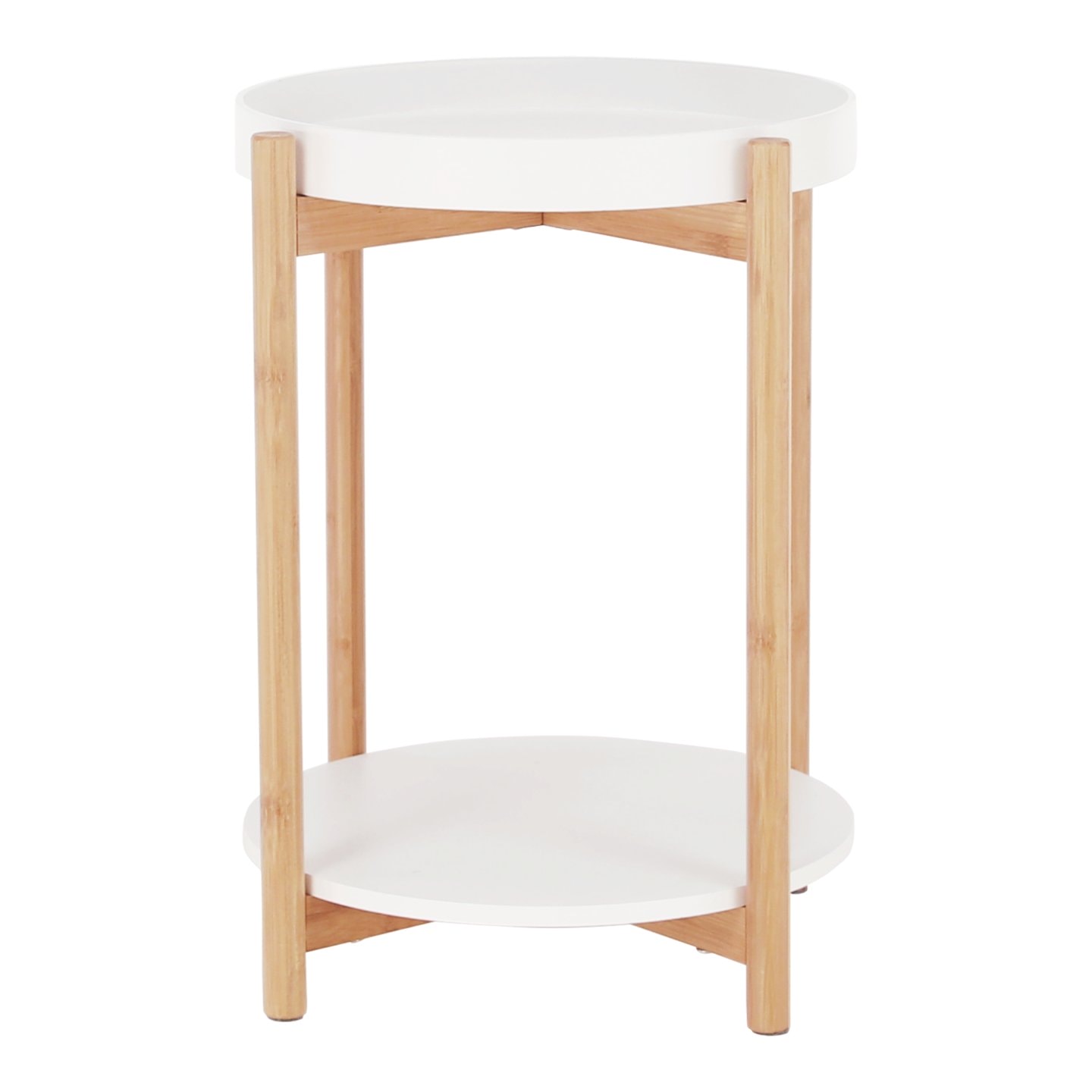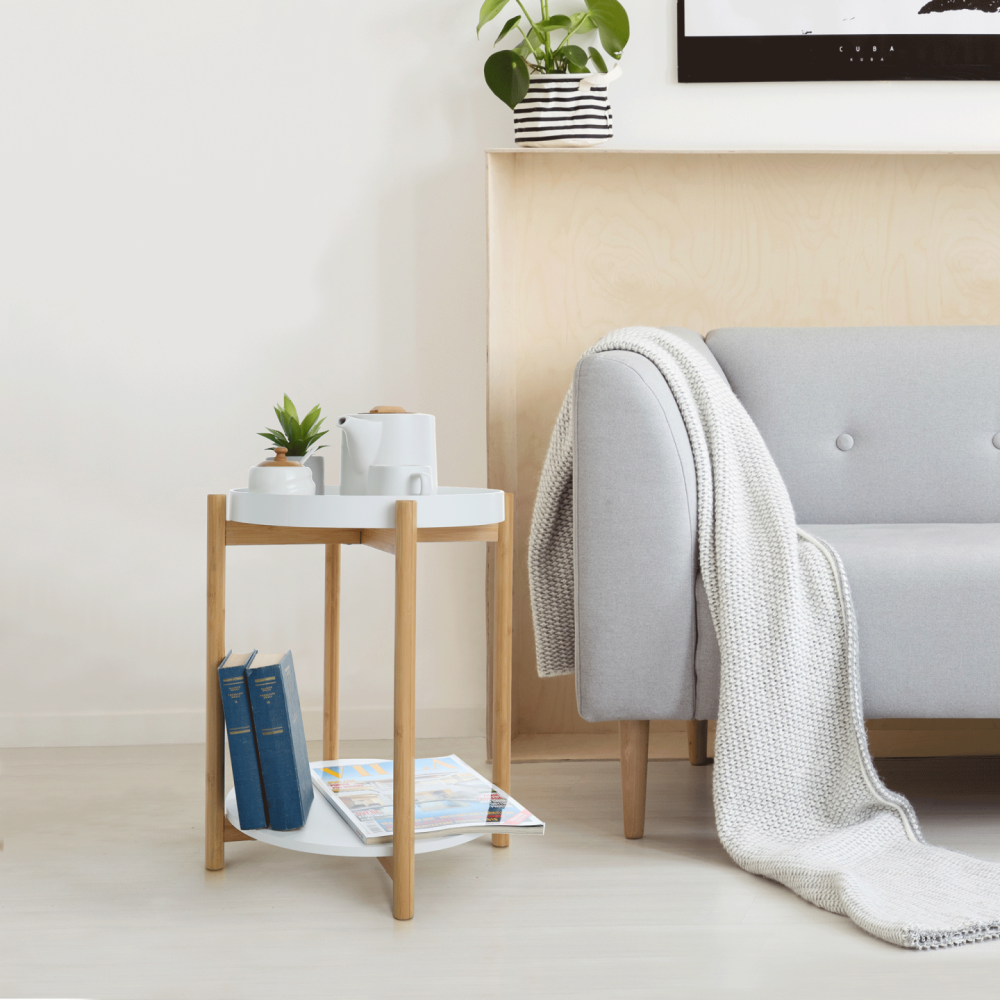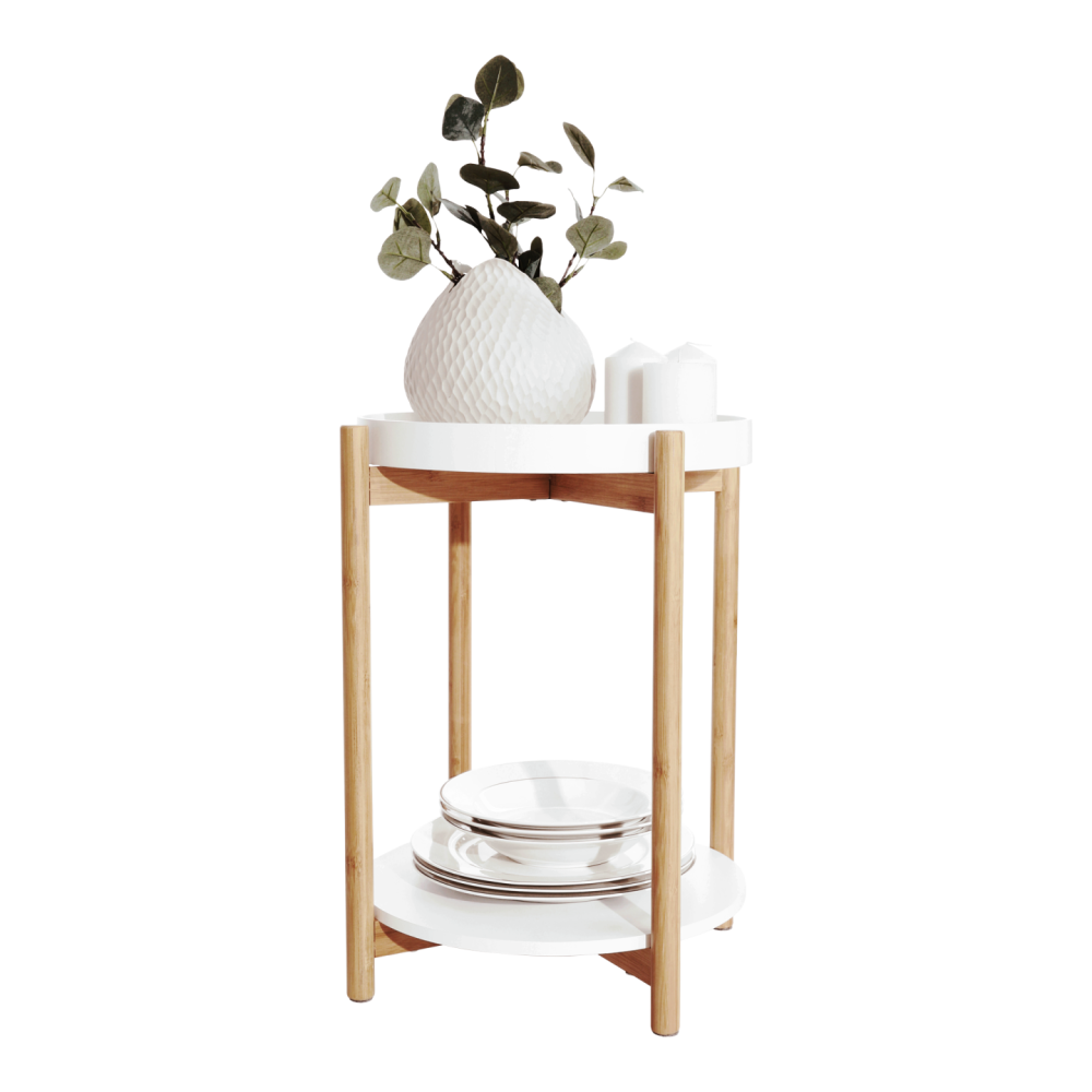 Stolek KABRA v nadčasovém barevném provedení bílá / přírodní je vyroben z bambusu a MDF. Zaujme vás svou odkládací plochou v podobě dvou polic. Vrchní hlubší police je odnímatelná a můžete ji použít jako tác či podnos.