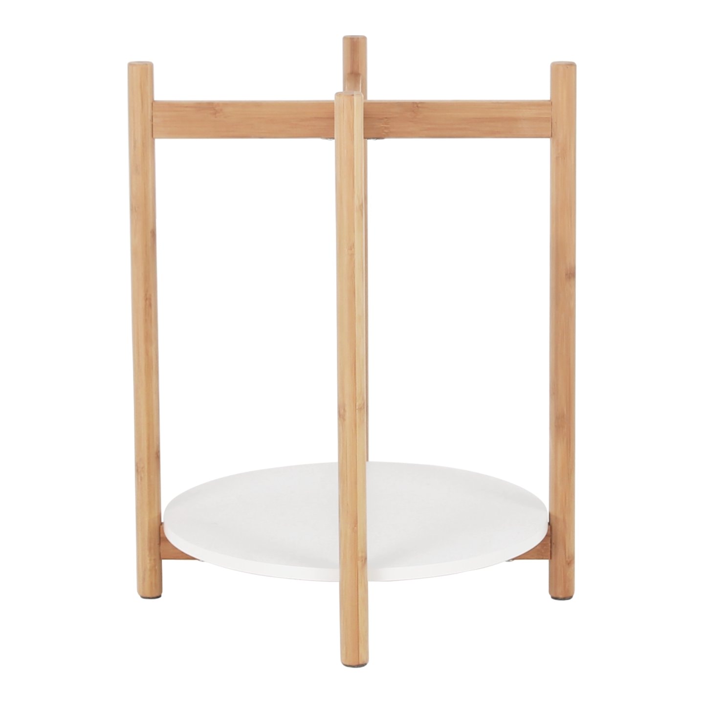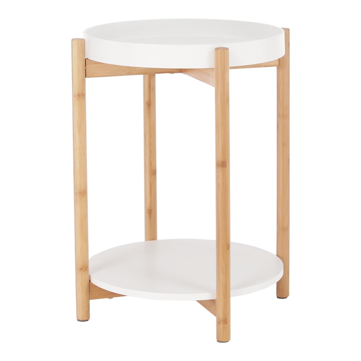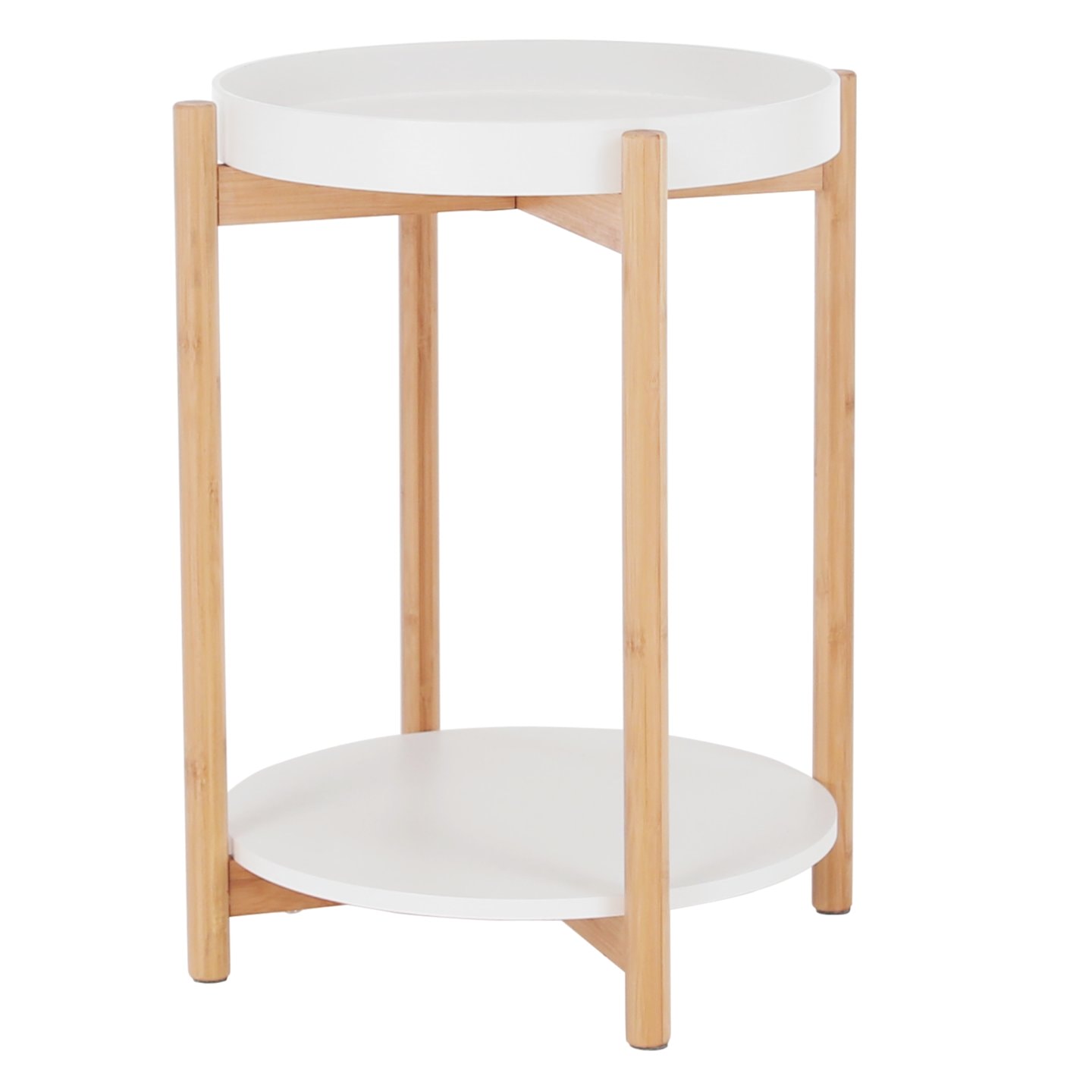 Stolek KABRA v nadčasovém barevném provedení bílá / přírodní je vyroben z bambusu a MDF. Zaujme vás svou odkládací plochou v podobě dvou polic. Vrchní hlubší police je odnímatelná a můžete ji použít jako tác či podnos.