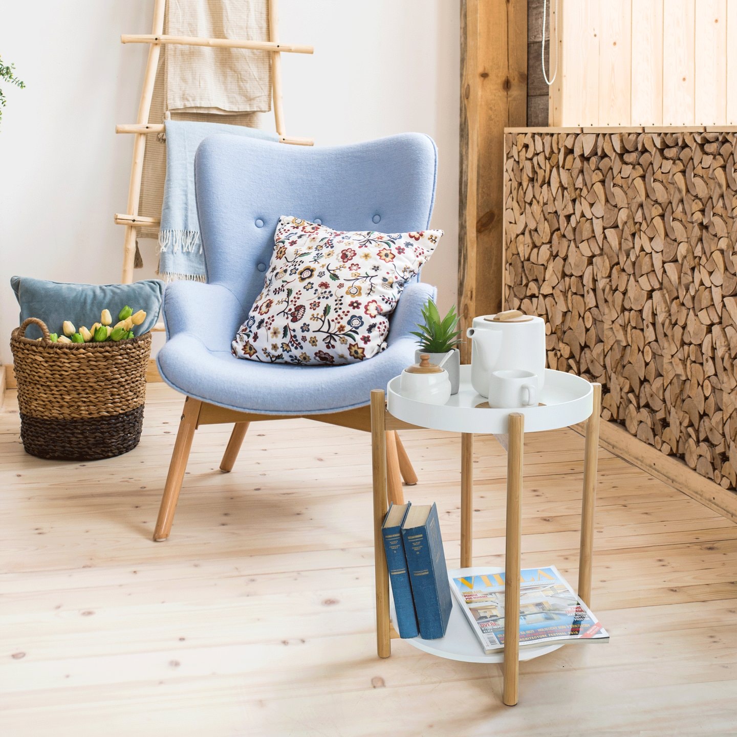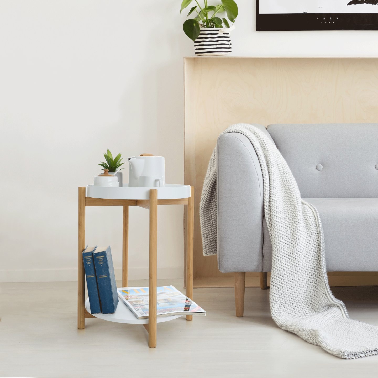 Příruční stolek s odnímatelnou tácem, bílá / přírodní, KABRA