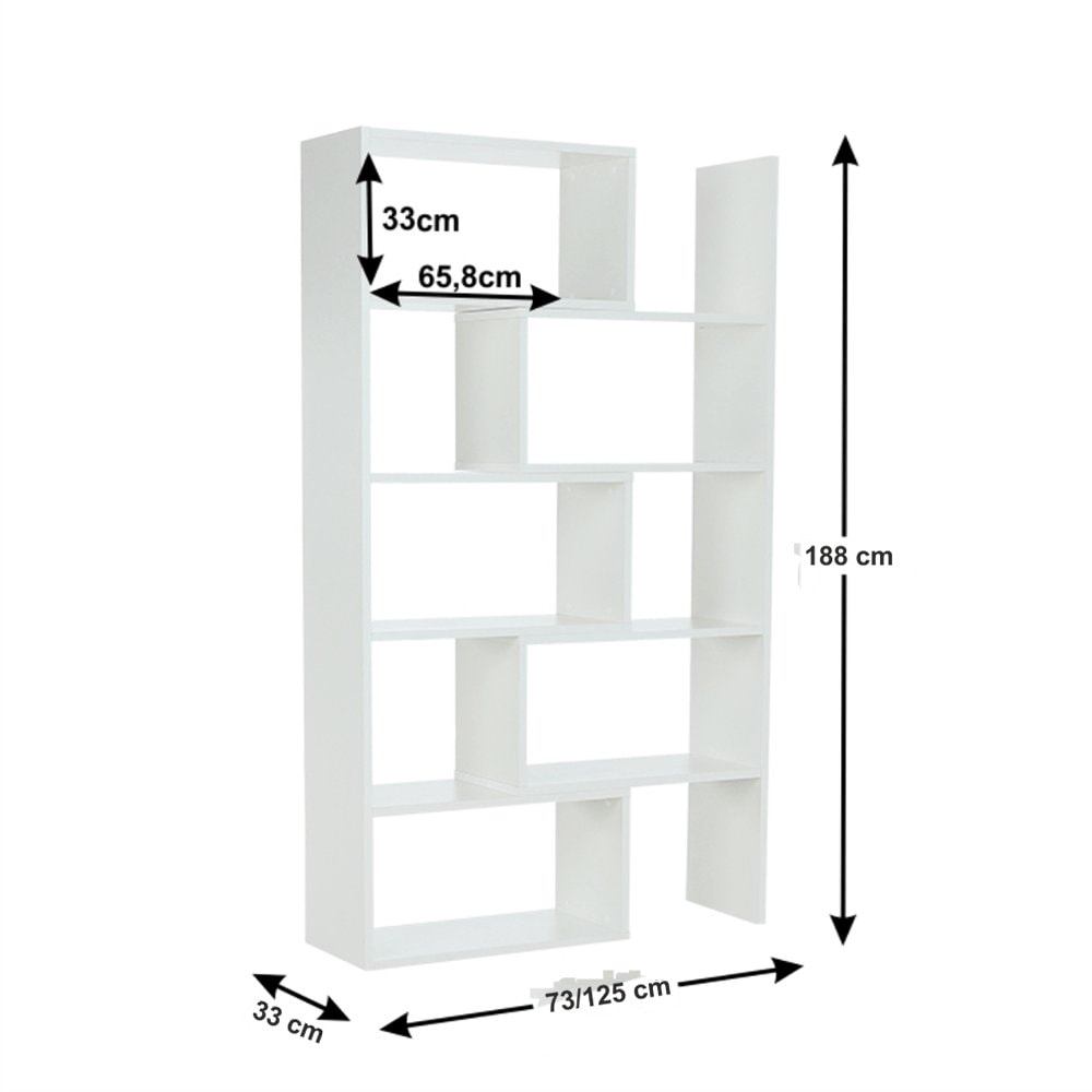 Moderní víceúčelový regál KLOE I Materiál: DTD laminovaná, Provedení: bílá, Rozměry (ŠxHxV): 73-125x33x188 cm Dodávané v demontu.
