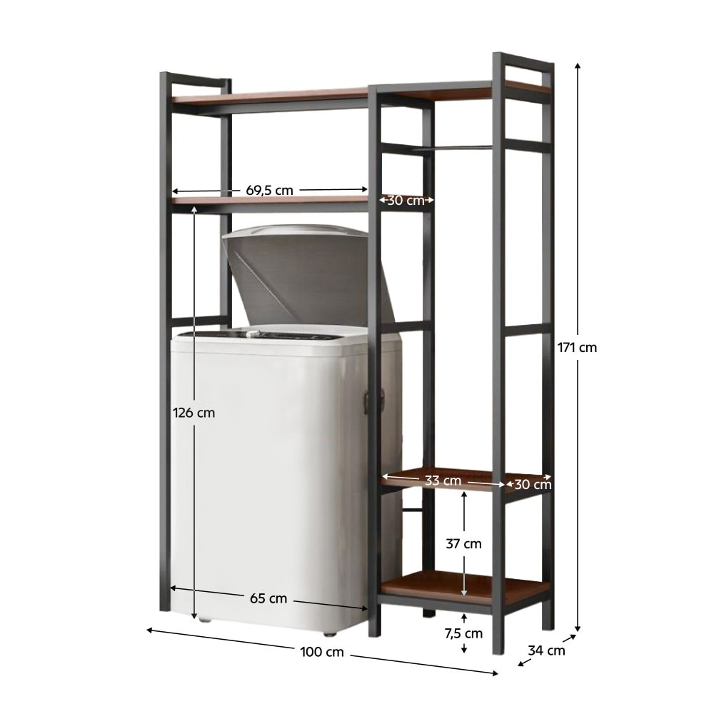 Umožňuje využít prostor nad pračkou a ke skladování potřebných věcí. Disponuje policemi na boku a na vrchní části. Umíte je prakticky využít k organizaci čistících prostředků, úložných košíků a doplňků, které potřebujete mít po ruce při domácích pracích. Součástí regálu je také praktická kovová tyč, kterou využijete při sušení textilií. Vyroben je z laminované MDF a doplněn o kovovou konstrukci v kombinaci odstínu tmavý dub a černé barvy.