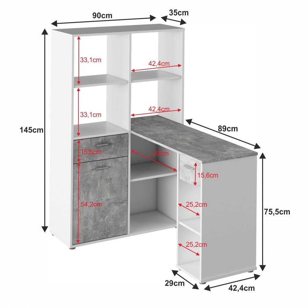 Rohový psací stůl MINESON Barva: bílá / beton Materiál: DTD laminovaná Rozměry (ŠxHxV): 124x90x145 cm Tloušťka materiálu: 16 mm S regálem Kvalitní slovenský výrobek. Dodávané v demontu.