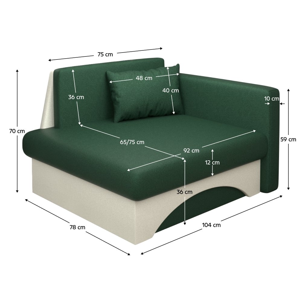Materiál: látka Malmo 37/05 Oděruodolnost textilie podle testu Martindale: 30 000 oděrů Barva: zelená/běžová Rozměry (ŠxHxV): 104x78x70 cm Plocha na spaní: 75x185 cm Výška sedu: 34,5 cm Hloubka sedu: 57 cm Šířka sedu: 92 cm Výška opěrky na ruku od země: 59 cm Rozměry opěrky na záda (ŠxV): 75x36 cm…