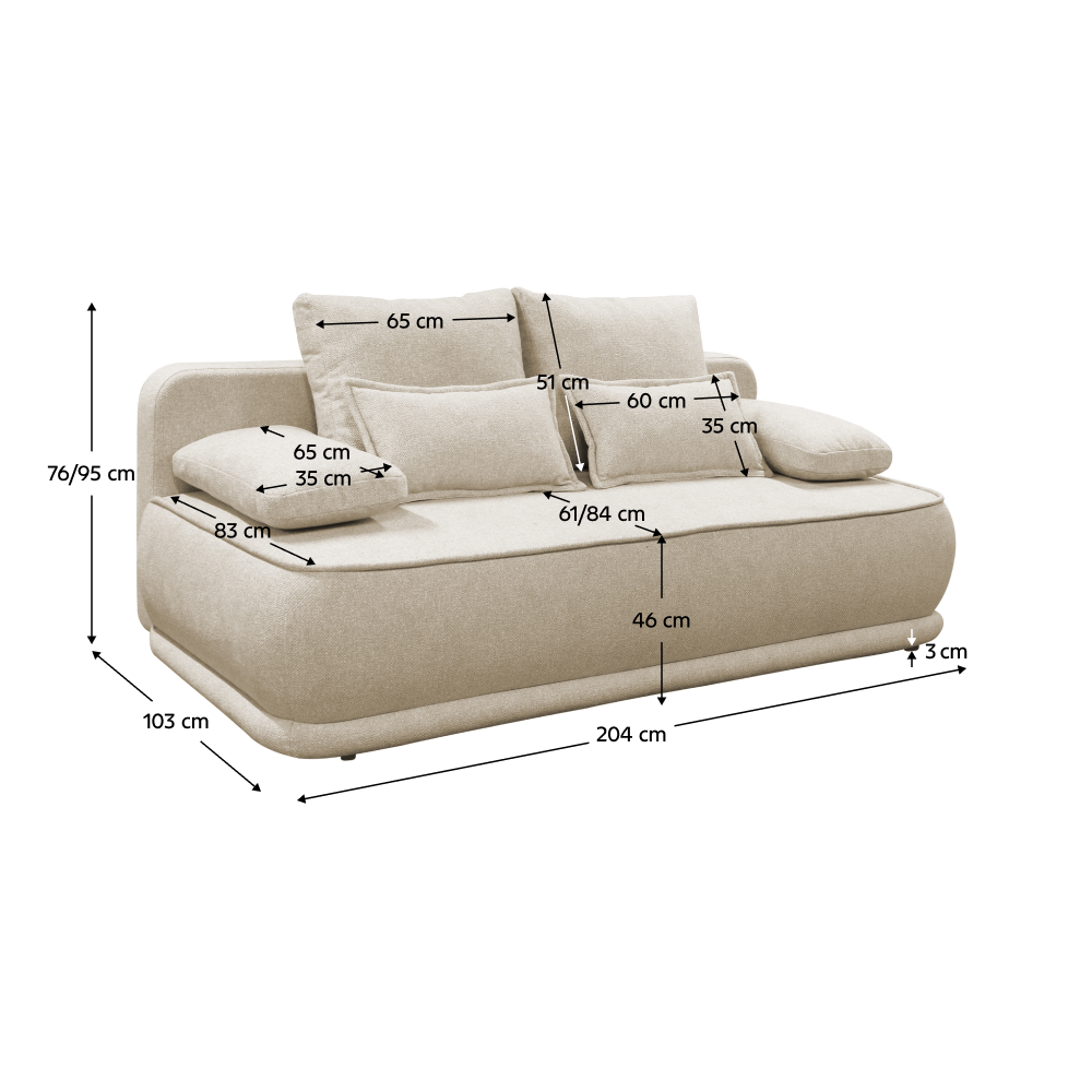 Celočalouněná je látkou Blur v provedení béžový melír a proto ji můžete umístit kdekoli do prostoru. Je rozkládací a v případě potřeby ji jednoduše rozložíte na lůžko, což oceníte při nečekané návštěvě. Vybavena je praktickým úložným prostorem, který je ideální pro uskladnění dek, polštářů či sezónních věcí. Pohovka je dodávána s polštáři, které poskytnou podporu zad a zároveň působí jako dekorace. O stabilitu se postarají černé plastové nožičky. Pohodlí při sezení na pohovce LAGO je zajištěno výplní v kombinaci pružiny vlnovcové a pur pěny.
