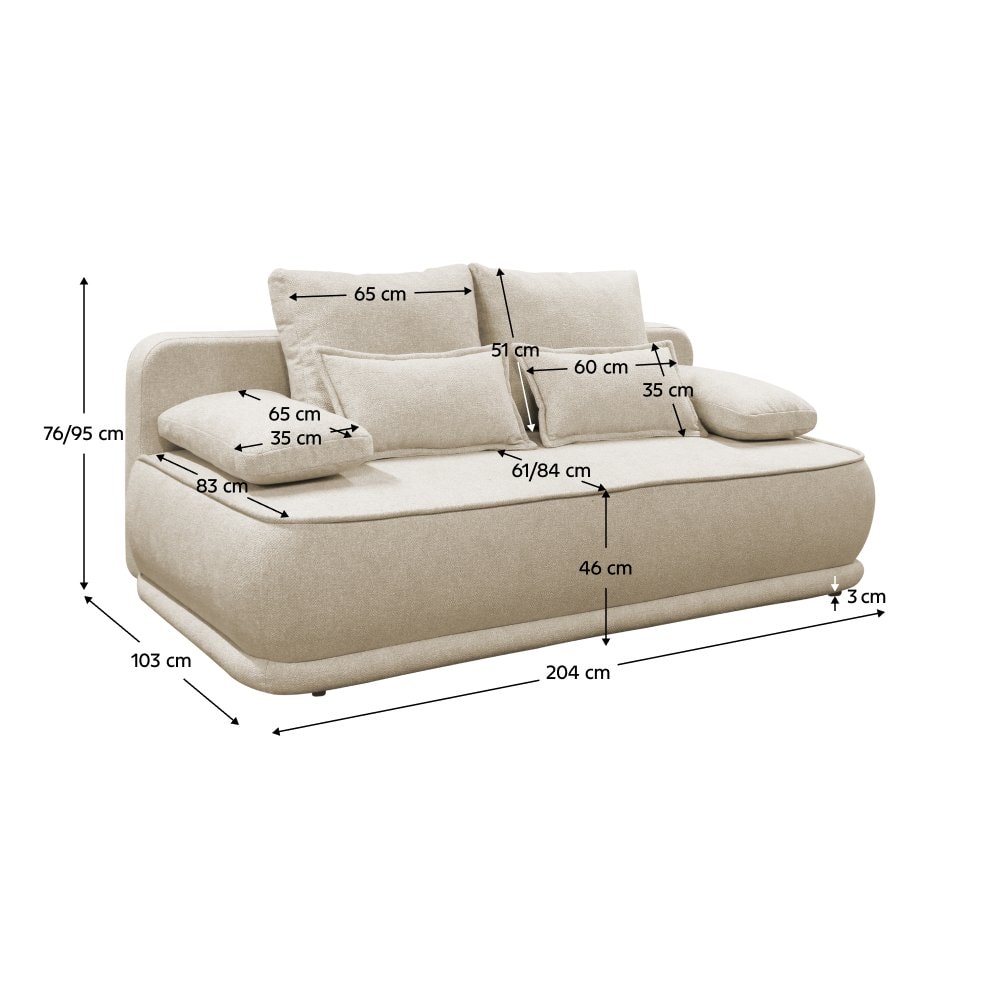 Materiál: látka Blur 1 Oděruodolnost textilie podle testu Martindale: 50 000 oděrů Barva: béžový melír Rozměry (ŠxHxV): 204x100x76/95 cm Plocha na spaní (ŠxD): 151x194 cm Výška sedu: 46 cm Hloubka sedu: 45/62/83 cm Nosnost na osobu: 90 kg Na nožičkách Materiál nožiček: plast Barva nožiček: černá…