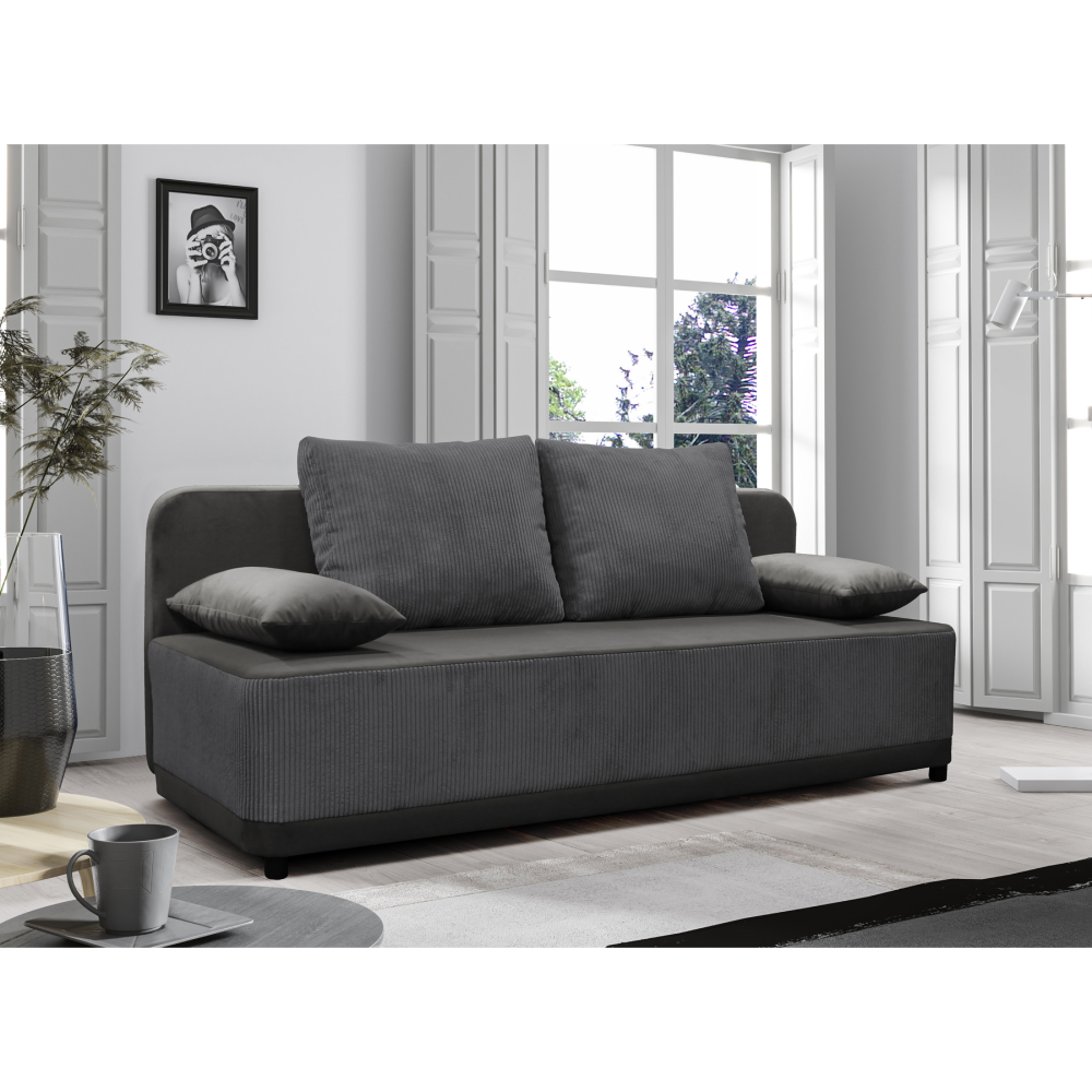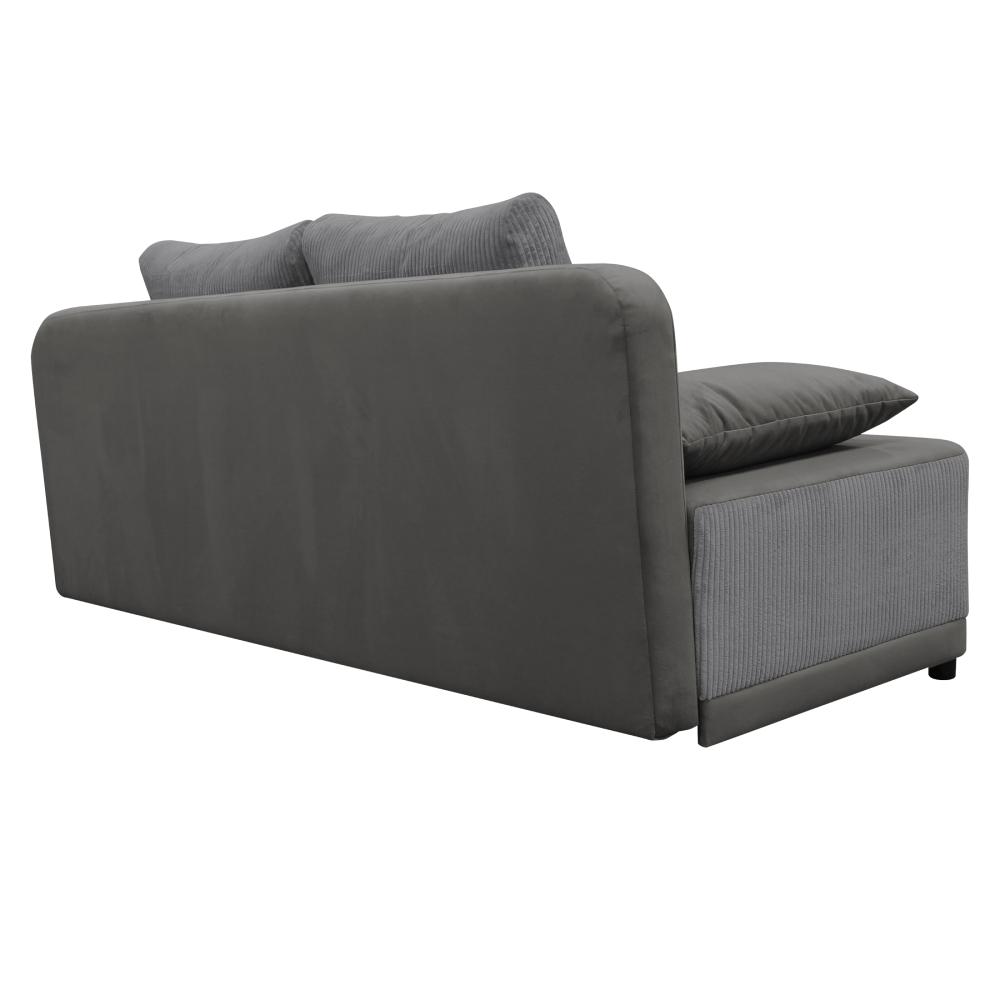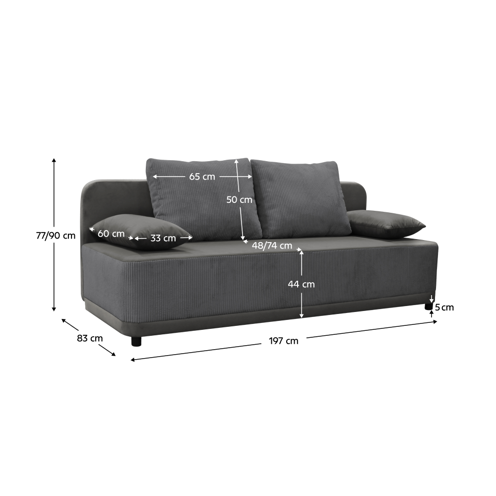 Pohovku si můžete umístit klidně i doprostřed místnosti, protože je celočalouněna látkami Manila a Poso v šedém barevném provedení. Určitě oceníte funkci rozkladu, díky které se pohovka změní na plnohodnotné lůžko o rozměru 141x296 cm. Postavena je na černých plastových nožičkách. O komfortní sezení se postará pur pěna. SENTY se s vámi podělí io úložný prostor, který poslouží zejména tehdy, když potřebujete odložit deky, přikrývky nebo sezónní oblečení.