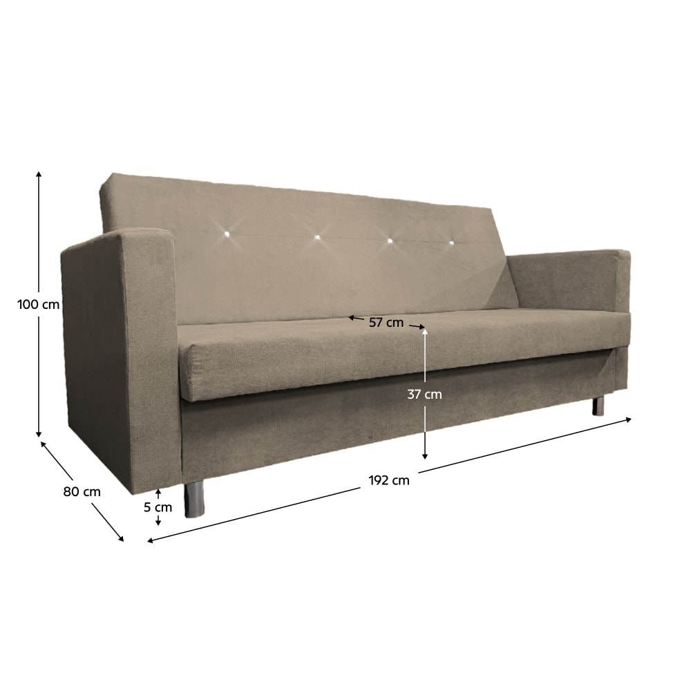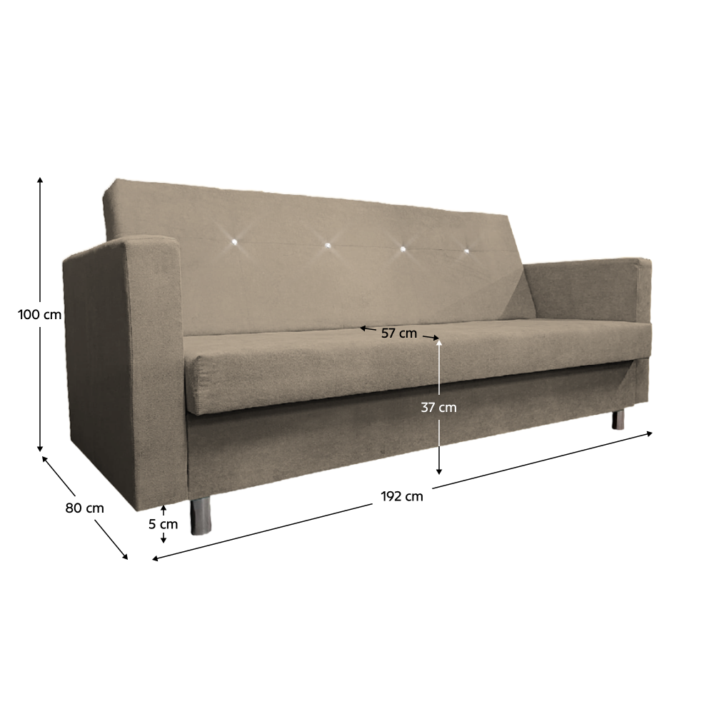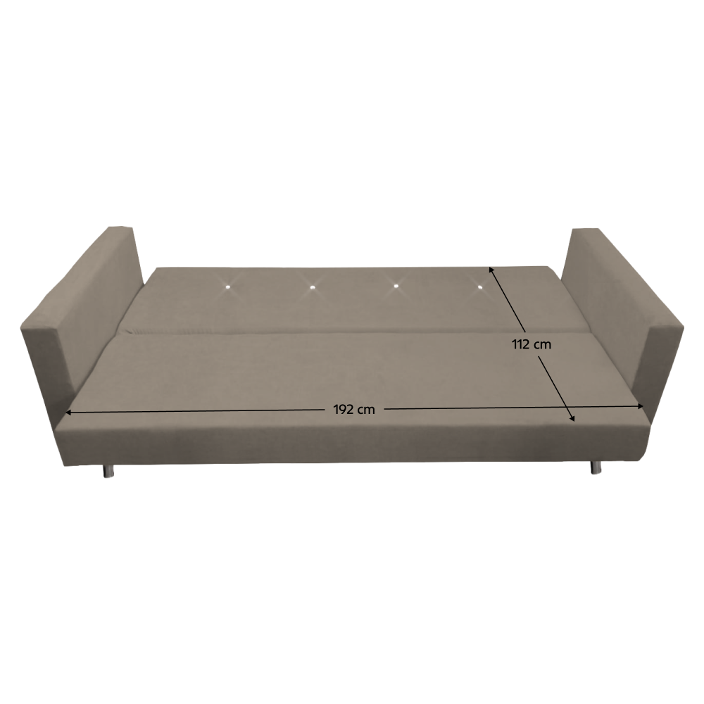 Materiál: látka Soro 23 Oděruodolnost látky podle testu Martindale: 90 000 oděrů Barva: šedobéžová Taupe Rozměry (ŠxHxV): 192x80x100 cm Plocha na spaní (ŠxD): 112x192 cm Výška sedu: 37 cm Hloubka sedu: 57 cm Na nožičkách Materiál nožiček: plast Barva nožiček: stříbrná Výška spodního prostoru od…