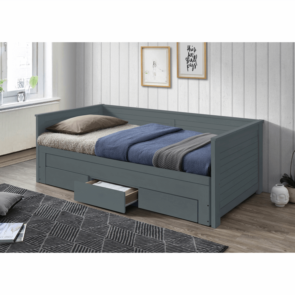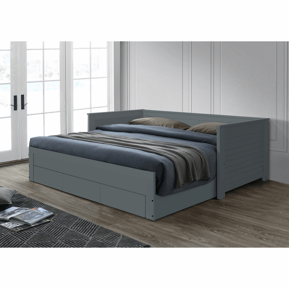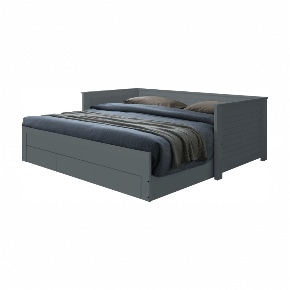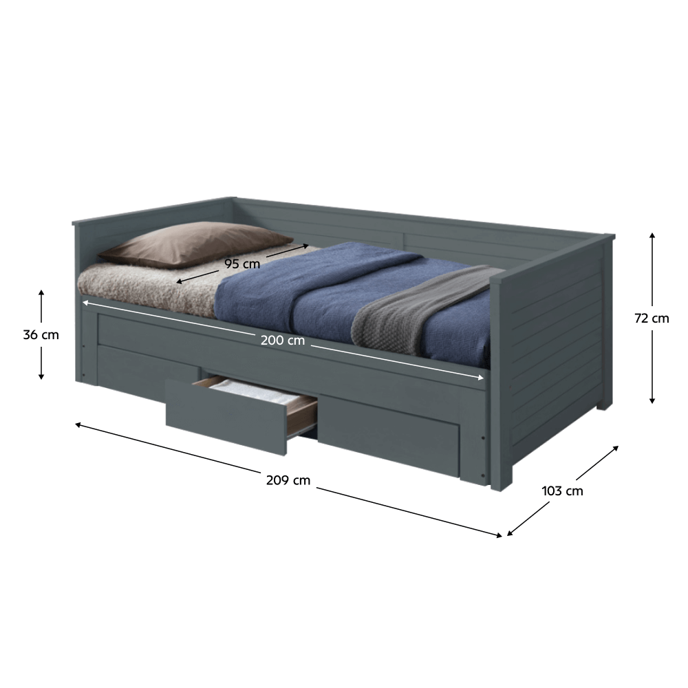 Materiál: masivní dřevo / MDF Barva: šedá Rozměry (ŠxHxV): 209x103x72 cm Rozměry jednolůžka (ŠxHxV): 90x200 cm Rozměry postele po rozložení (ŠxHxV): 180x200 cm Hloubka postele po rozložení: 186 cm Vysouvací konstrukce na kolečkách Dodávané s 2 laťkový rošt Výška po rošt: 36 cm Nosnost: 110 kg…