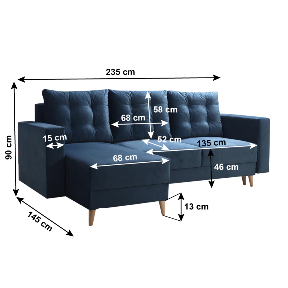 Materiál čalounění: látka Kronos 9 Oděruodolnost látky podle testu Martindale: 60 000 Barva čalounění: modrá Rozměry (ŠxHxV): 235x145x90 cm Plocha na spaní (ŠxD): 130x200 cm Výška sedu: 46 cm Hloubka sedu: 52 cm Šířka otomanu: 68 cm Šířka sedáku: 135 cm Šířka opěrky na ruku: 15 cm Výška spodního…