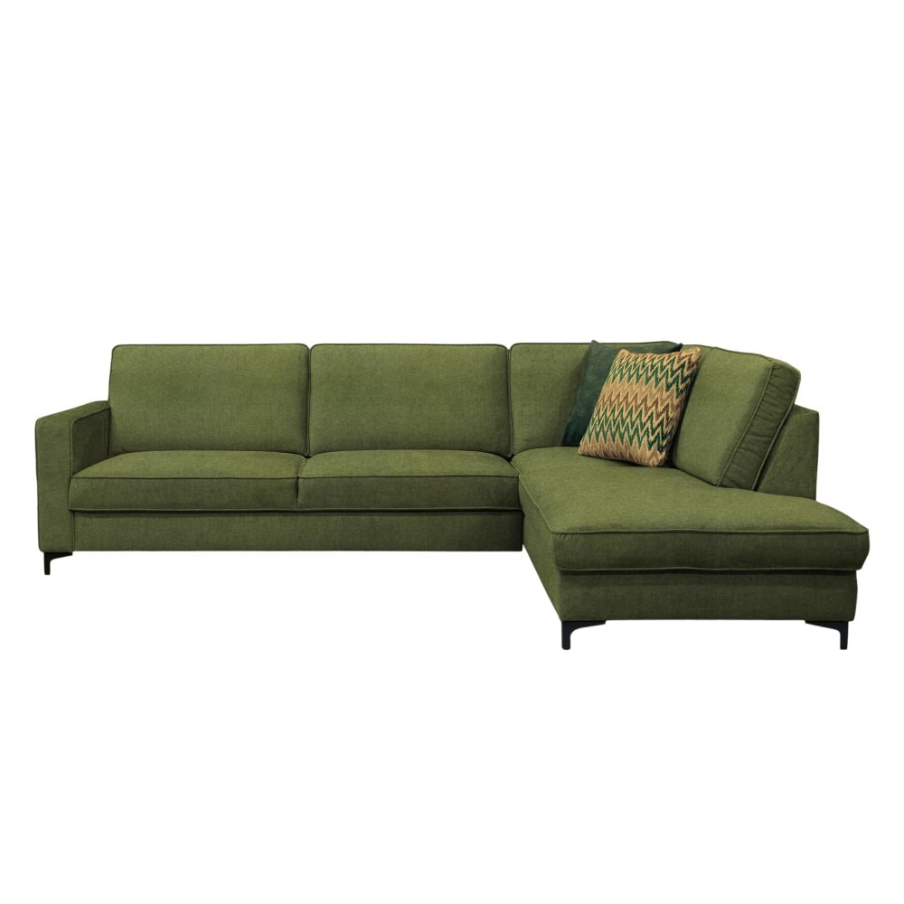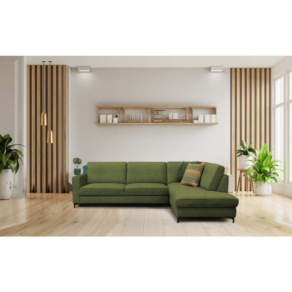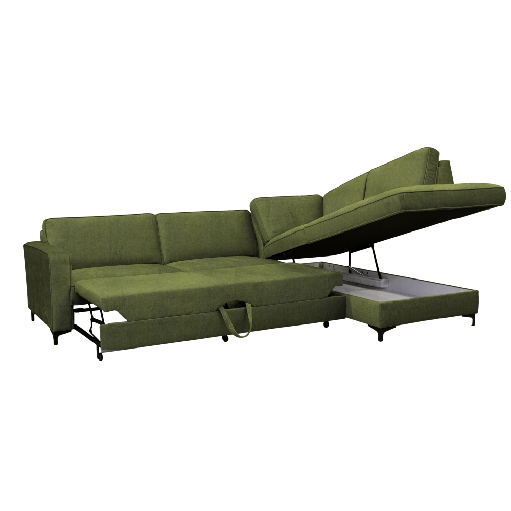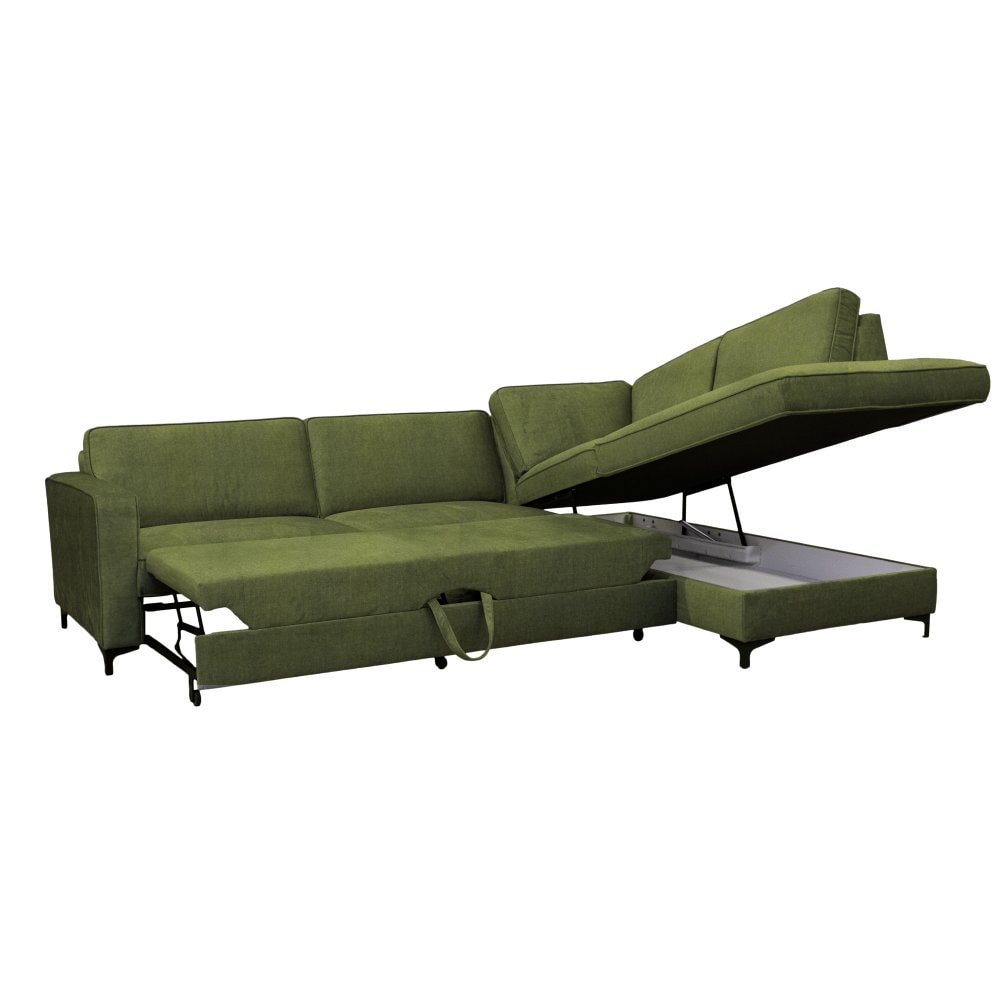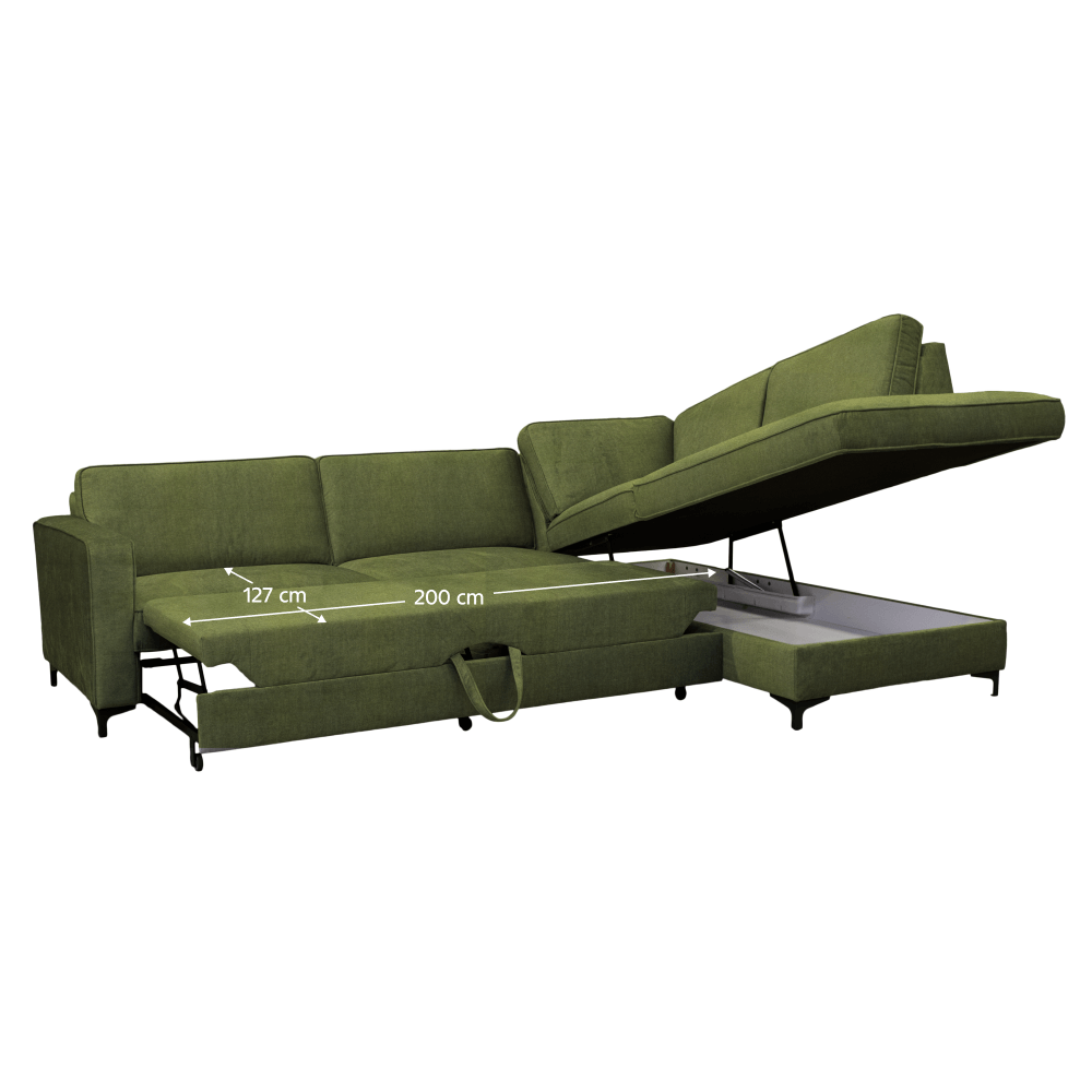 Je celočalouněná látkou Toronto 13 v olivové barvě, která je v dnešní době velmi elegantní a elegantně zapadne do každého moderního interiéru. Pohodlné sezení zajišťuje výplň z vlnovcové pružiny v kombinaci s PUR pěnou. Nabízí praktický úložný prostor v otomanové části, který vám umožní uložit různé předměty a udržet v místnosti pořádek. Součástí pohovky jsou také polštáře, které se postarají o pohodlné opření zad. Dopřejte si lenošení nebo příležitostné spaní. Díky rozkládací funkci vykouzlíte plochu na spaní o rozměrech až 127x200 cm. Sedačka má moderní design doplněný stylovými kovovými nožkami v černé barvě.