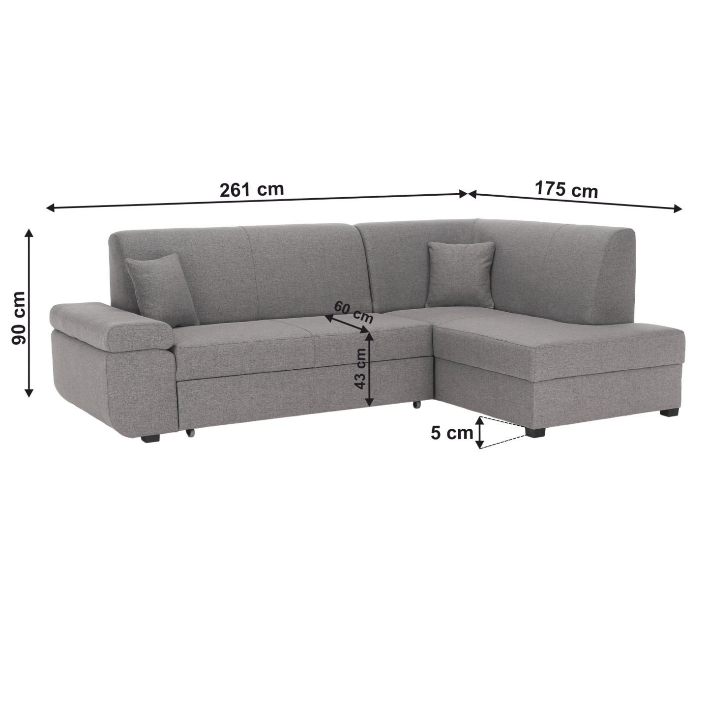 Materiál: látak Neve 85 Oděruodolnost textilie Neve podle testu Martindale: 100 000 oděrů Barva: šedý melír Rozměry (ŠxHxV): 261x175x90 cm Rozkládací Rohová Celočalouněná Plocha na spaní (ŠxD): 128x196 cm Výška sedu: 43 cm Hloubka sedu: 60 cm Výška spodního prostoru od podlahy: 5 cm Nosnost na…