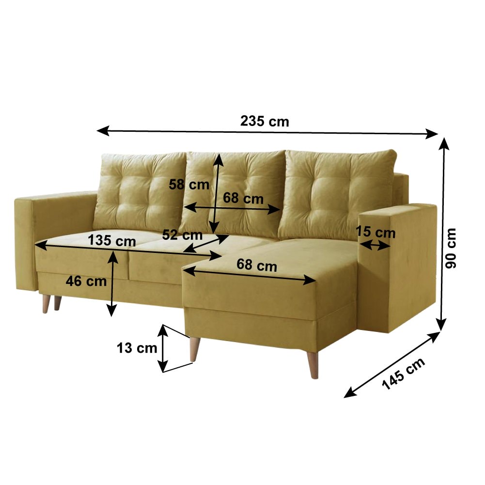 Materiál čalounění: látka Kronos 11 Oděruodolnost látky podle testu Martindale: 60 000 Barva čalounění: žlutá Rozměry (ŠxHxV): 235x145x90 cm Plocha na spaní (ŠxD): 130x200 cm Výška sedu: 46 cm Hloubka sedu: 52 cm Šířka otomanu: 68 cm Šířka sedáku: 135 cm Šířka opěrky na ruku: 15 cm Výška spodního…