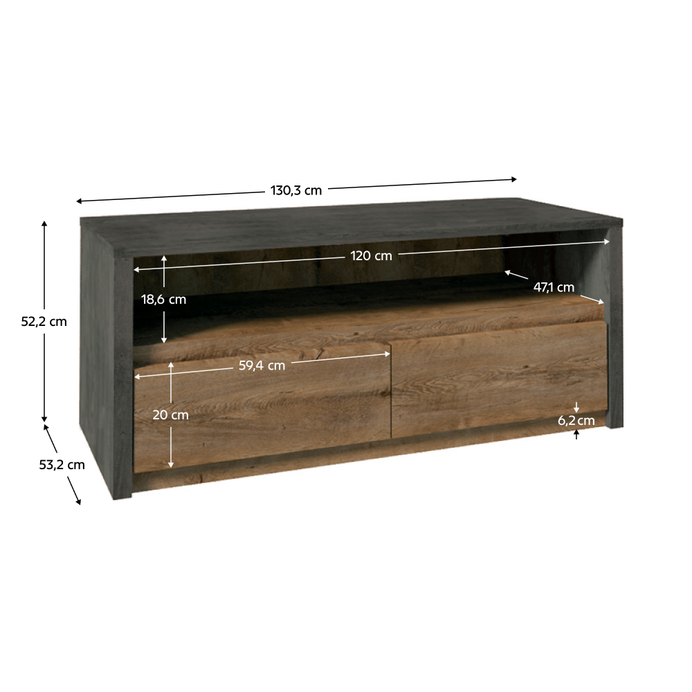 RTV stolek 130 MONTANA poskytuje dostatek úložného prostoru v podobě dvou šuplíků a otevřeného úložného prostoru. Neuvěřitelně působící moderní design bez úchytek.