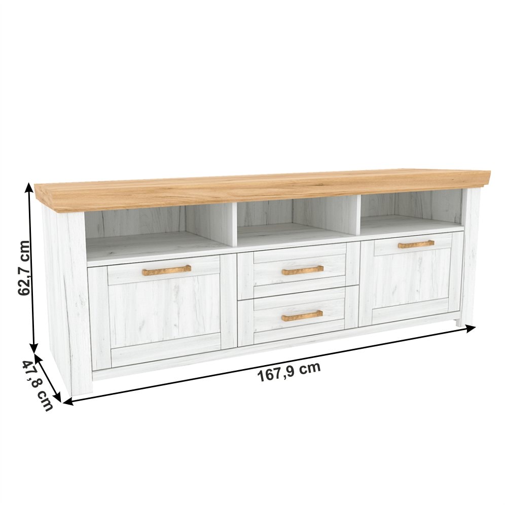 Materiál: DTD laminovaná / MDF Barva: dub craft zlatý / dub craft bílý Rozměry (ŠxHxV): 167,9x47,8x62,7 cm Tloušťka materiálu korpus: 16 mm Tloušťka materiálu vrchní deska: 22 mm Tloušťka materiálu dvířka: 19 mm Výška spodního prostoru od podlahy je 4,2 cm dvou šuplíků dvou skříněk otevřený prostor…