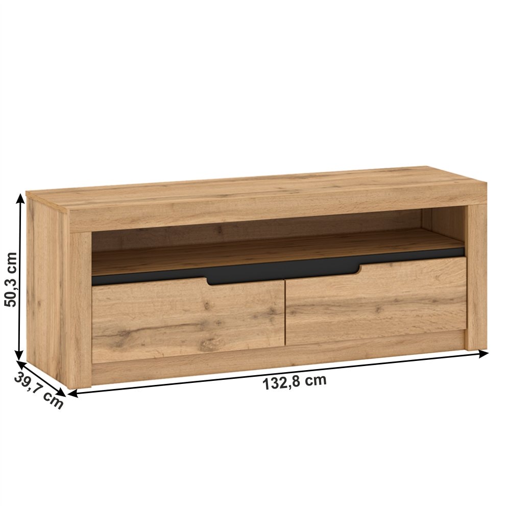Materiál: DTD laminovaná / MDF Barva: dub Wotan Rozměry (ŠxHxV): 132,8x39,7x50,3 cm Tloušťka materiálu korpus: 16 mm dva šuplíky Otevřený úložný prostor Dodávané v demontu