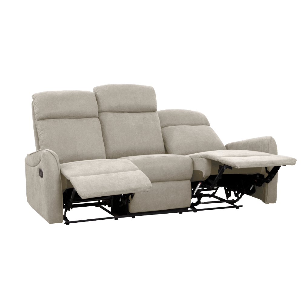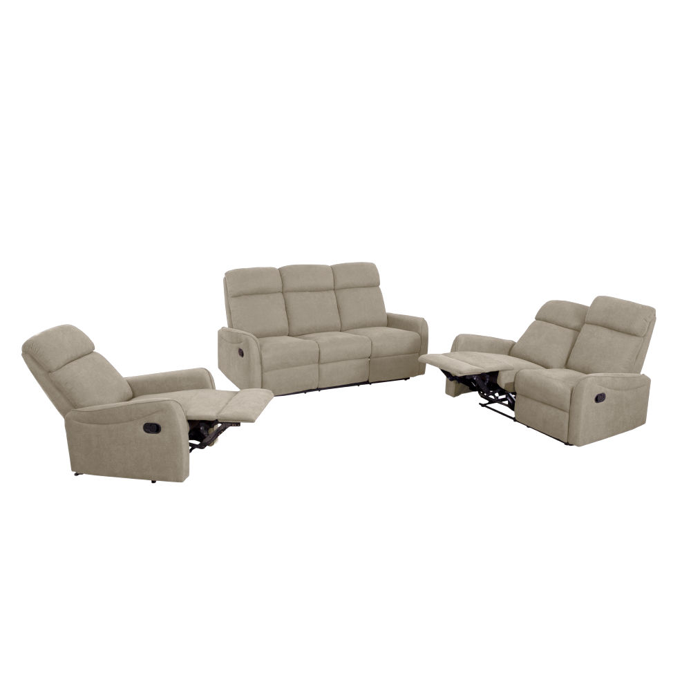 Složená je z trojsedu, dvousedu a křesla v nestárnoucím barevném provedení šedohnědá taupe. Trojsed disponuje funkcí polohování levé a pravé části a střední část je pevná. Dvojsed tvoří dvě křesla, která lze polohovat nezávisle na sobě. Funkcí polohování disponuje samozřejmě i křeslo. Podnož vysunete pomocí páčky na boční straně křesla. Opěradlo sklopíte jemným potlačením dozadu. Když opět zatlačíte, opěradlo se vrátí do původní polohy. Podnož sklopíte tak, že do ní zatlačíte nohama. Dřevěná konstrukce sestavy FASAN je vyrobena z eukalyptu. Sedací část je vyplněna PUR pěnou.