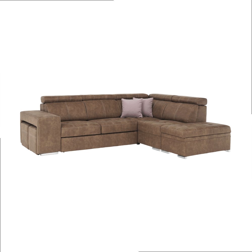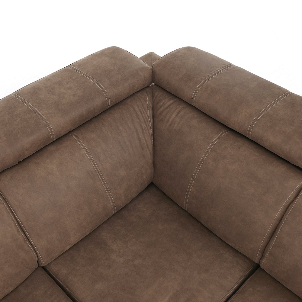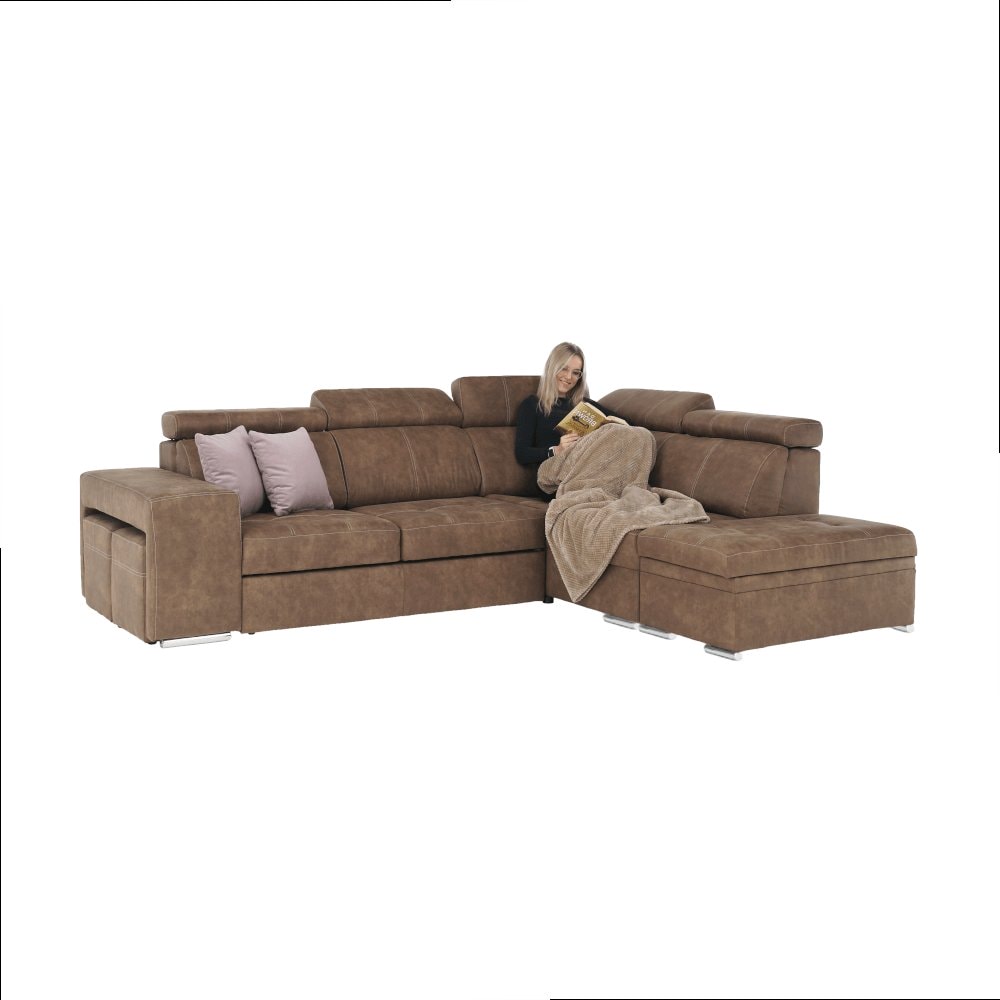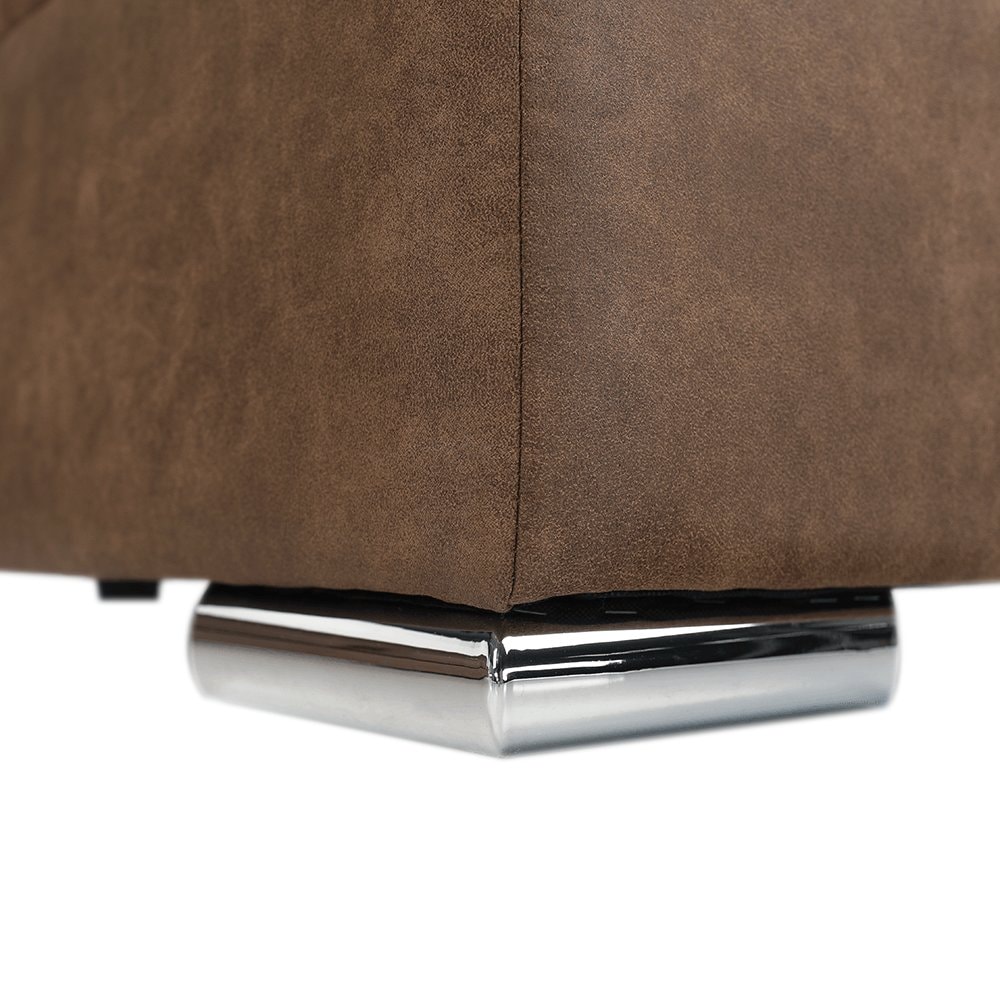 Sedačka také disponuje dvěma taburety, které jsou umístěny v opěrce na ruce. Vyrobeno je z kvalitní látky s efektem broušené kůže Preston v hnědé barvě.