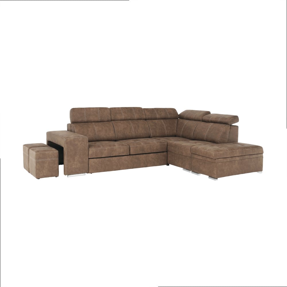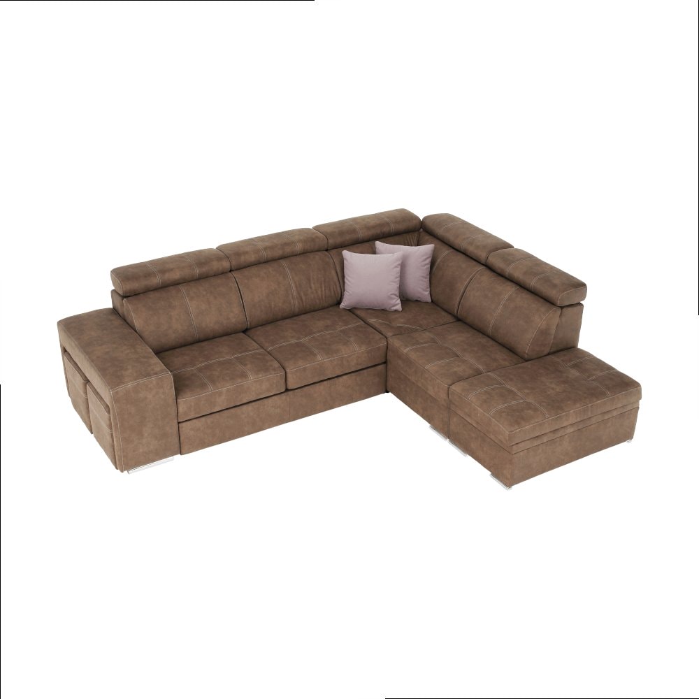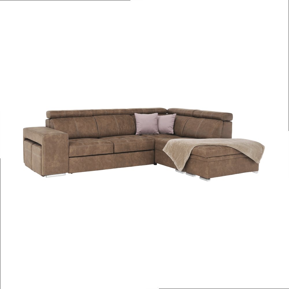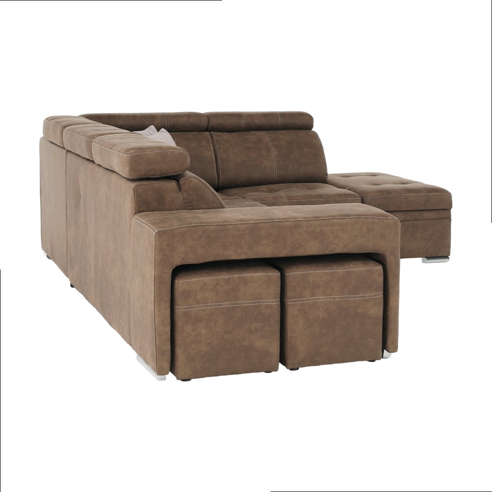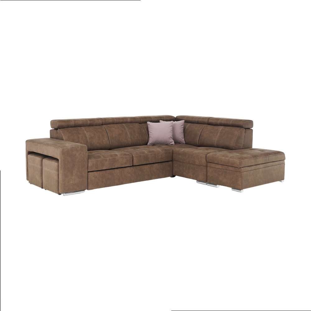 Sedačka také disponuje dvěma taburety, které jsou umístěny v opěrce na ruce. Vyrobeno je z kvalitní látky s efektem broušené kůže Preston v hnědé barvě.