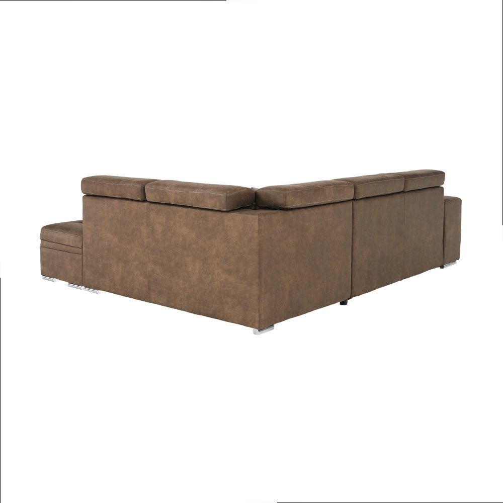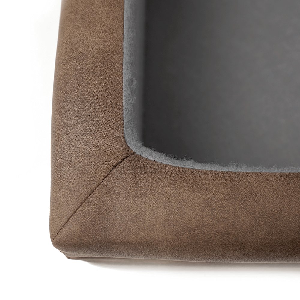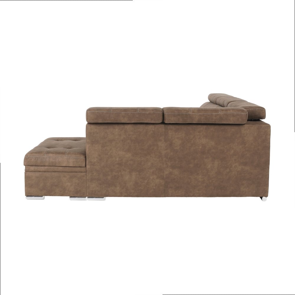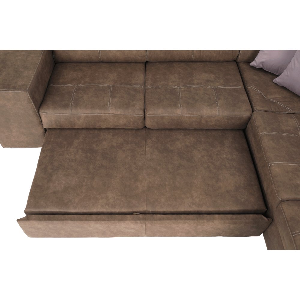 Sedačka také disponuje dvěma taburety, které jsou umístěny v opěrce na ruce. Vyrobeno je z kvalitní látky s efektem broušené kůže Preston v hnědé barvě.