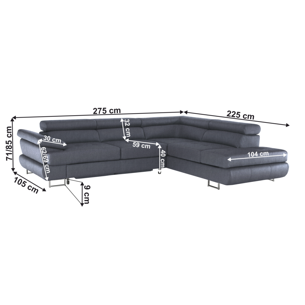 Materiál: látka Soro 97 Oděruodolnost textilie podle testu Martindale: 90 000- 100 000 oděrů Barva: šedá Rozměry (ŠxHxV): 275x225x71/85 cm. Výška sedu: 40 cm Hloubka sedu: 59 cm Výška spodního prostoru od podlahy: 9 cm Výška zádové opěrky: 32/50 cm Hloubka sklopené zádové opěrky: 41 cm Opěrka na…