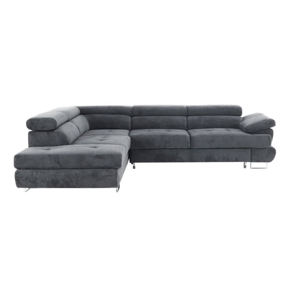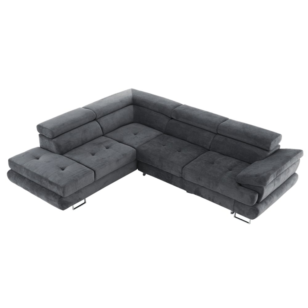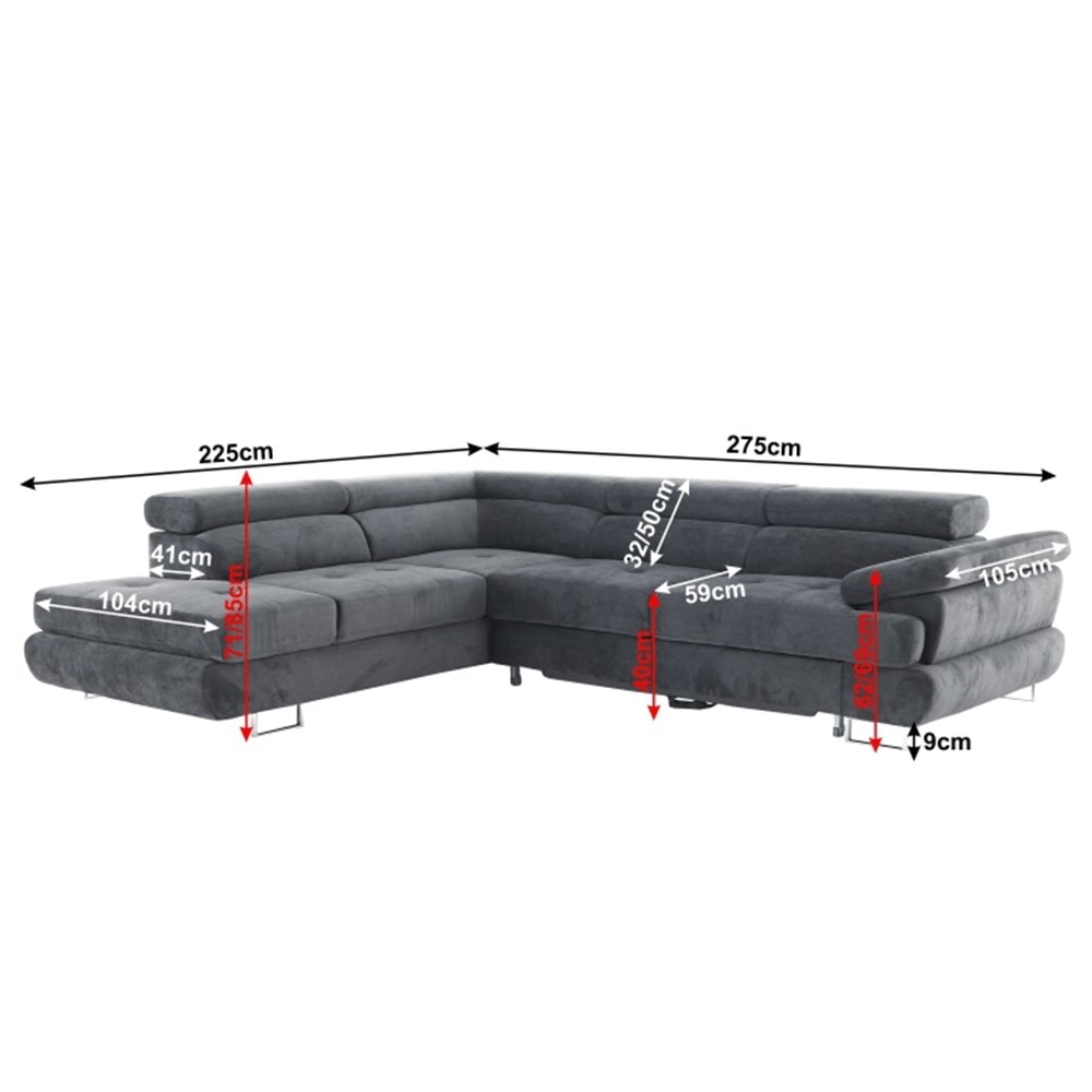 Materiál: látka Soro 97 Oděruodolnost textilie podle testu Martindale: 90 000- 100 000 oděrů Barva: šedá Rozměry (ŠxHxV): 275x225x71/85 cm. Výška sedu: 40 cm Hloubka sedu: 59 cm Výška spodního prostoru od podlahy: 9 cm Výška zádové opěrky: 32/50 cm Hloubka sklopené zádové opěrky: 41 cm Opěrka na…