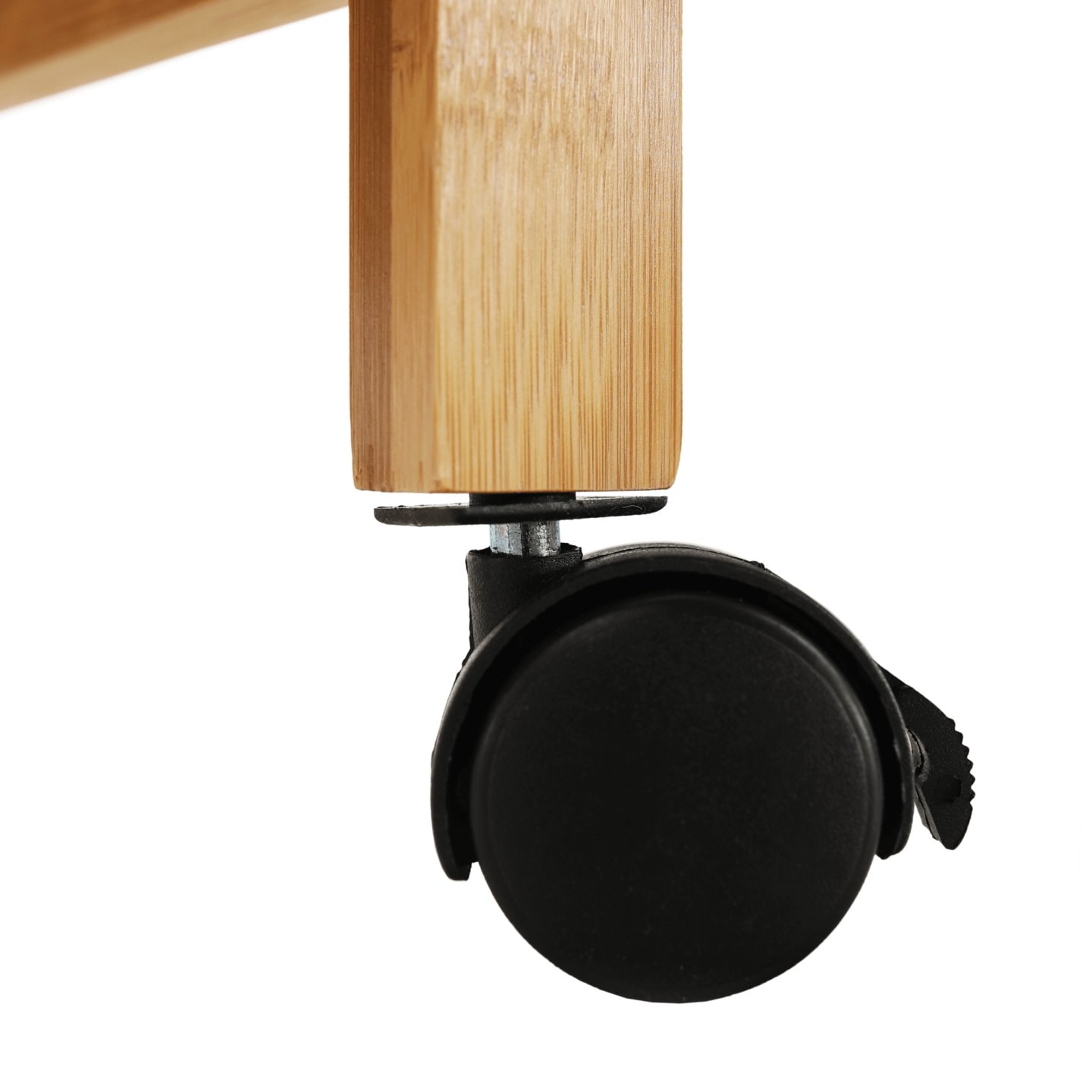 Hrdě se pyšní jedinečným designem a množstvím odkládacího prostoru. Nabízí místo pro všechno. Disponuje jednou zásuvkou na příbory nebo jiné kuchyňské náčiní. Výsuvný košík vyrobený z kovu je perfektní řešení na uskladnění ovoce a zeleniny. Nad košíkem se nachází laťová police s držákem pro lahve. Ocet, olej, víno či jiné dobroty zde najdou své místo. V dolní části se nachází dvoudveřová skříňka, ve které lze dobře uskladnit nádobí nebo zásoby potravin a v případě potřeby jsou k dispozici. Vozík je vyroben z bambusu v jedinečném přírodním provedení, hravě a snadno zapadne do jakéhokoliv interiéru. O rychlý přesun se starají čtyři kolečka z čehož dvě disponují brzdami které ho neochvějně drží na zvoleném místě. Přesouvat ho můžete snadno díky rukojeti na boční straně. Přiveze, odveze a uskladní vše co budete potřebovat. Vaši hosté zůstanou ohromeni tímto jedinečným a šarmantním sluhou.