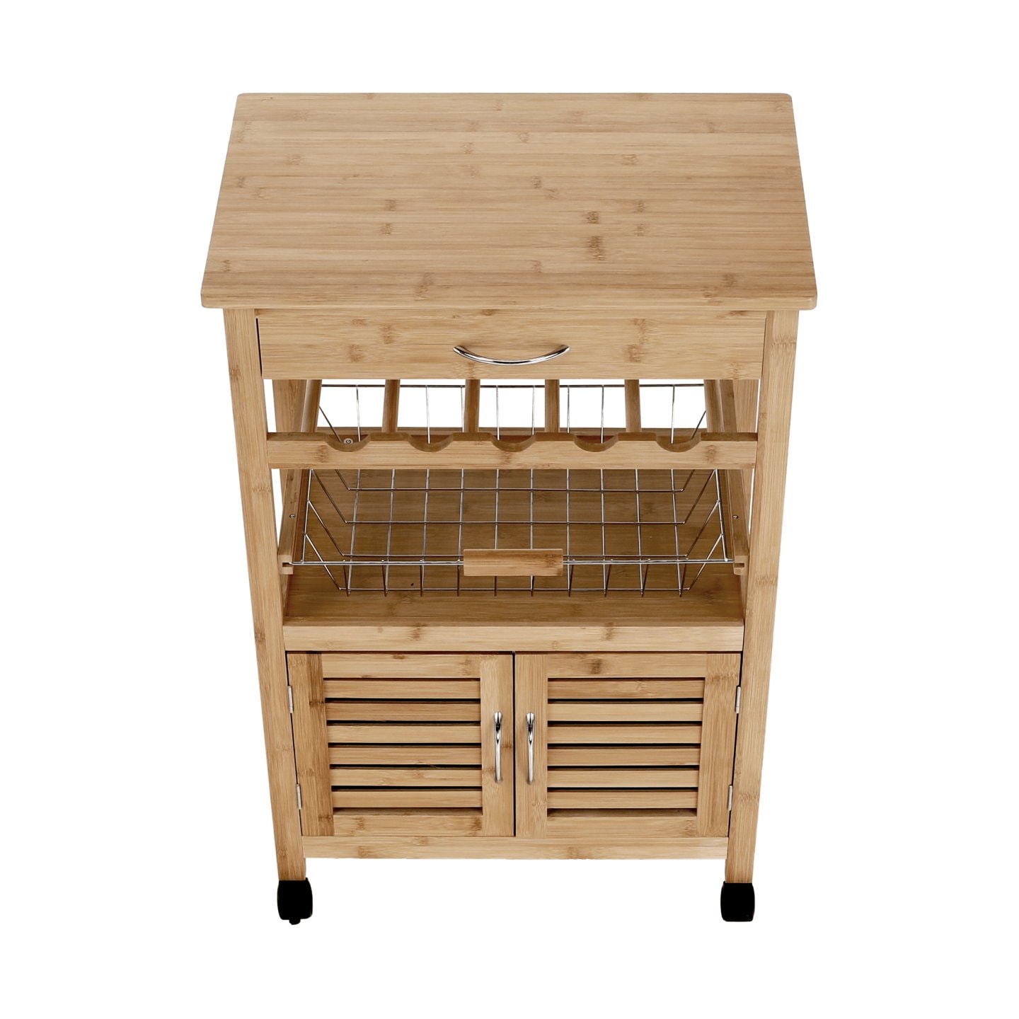 Hrdě se pyšní jedinečným designem a množstvím odkládacího prostoru. Nabízí místo pro všechno. Disponuje jednou zásuvkou na příbory nebo jiné kuchyňské náčiní. Výsuvný košík vyrobený z kovu je perfektní řešení na uskladnění ovoce a zeleniny. Nad košíkem se nachází laťová police s držákem pro lahve. Ocet, olej, víno či jiné dobroty zde najdou své místo. V dolní části se nachází dvoudveřová skříňka, ve které lze dobře uskladnit nádobí nebo zásoby potravin a v případě potřeby jsou k dispozici. Vozík je vyroben z bambusu v jedinečném přírodním provedení, hravě a snadno zapadne do jakéhokoliv interiéru. O rychlý přesun se starají čtyři kolečka z čehož dvě disponují brzdami které ho neochvějně drží na zvoleném místě. Přesouvat ho můžete snadno díky rukojeti na boční straně. Přiveze, odveze a uskladní vše co budete potřebovat. Vaši hosté zůstanou ohromeni tímto jedinečným a šarmantním sluhou.