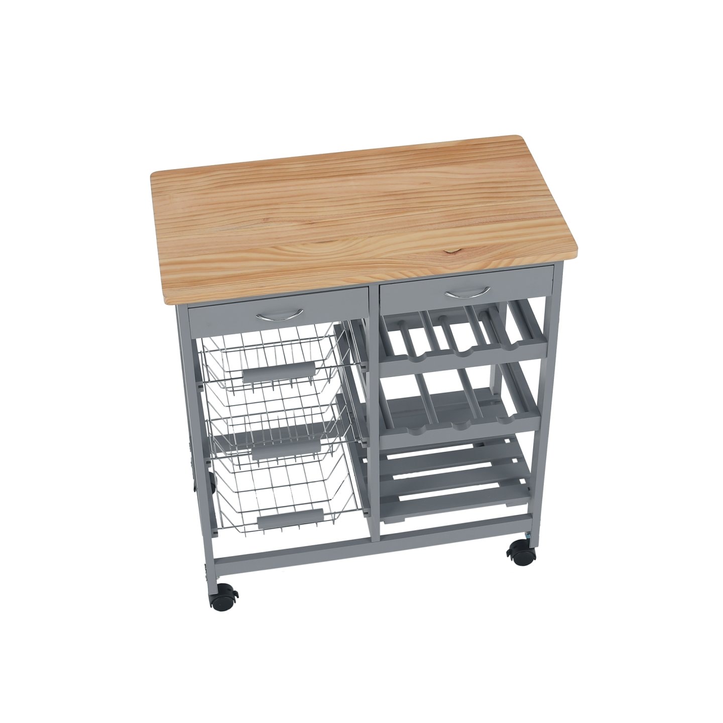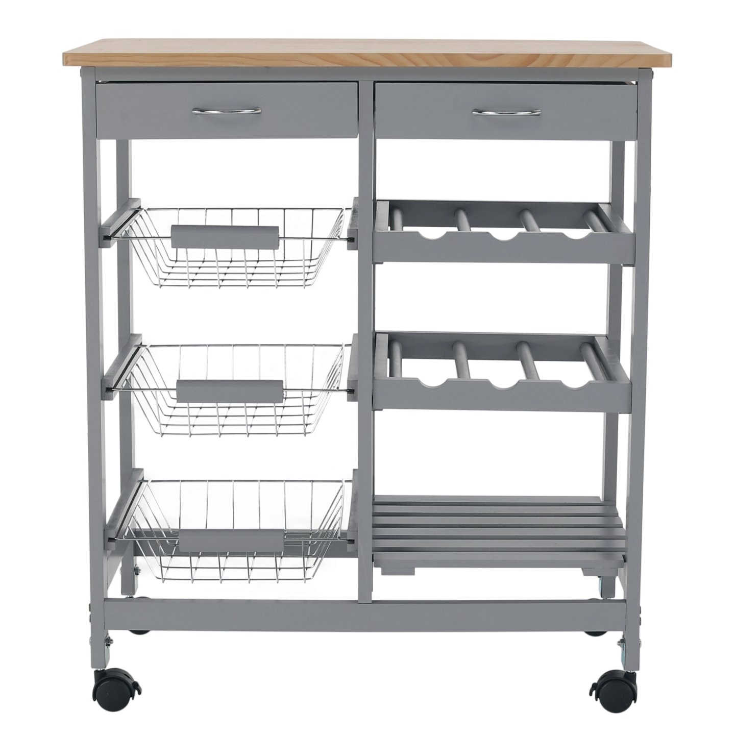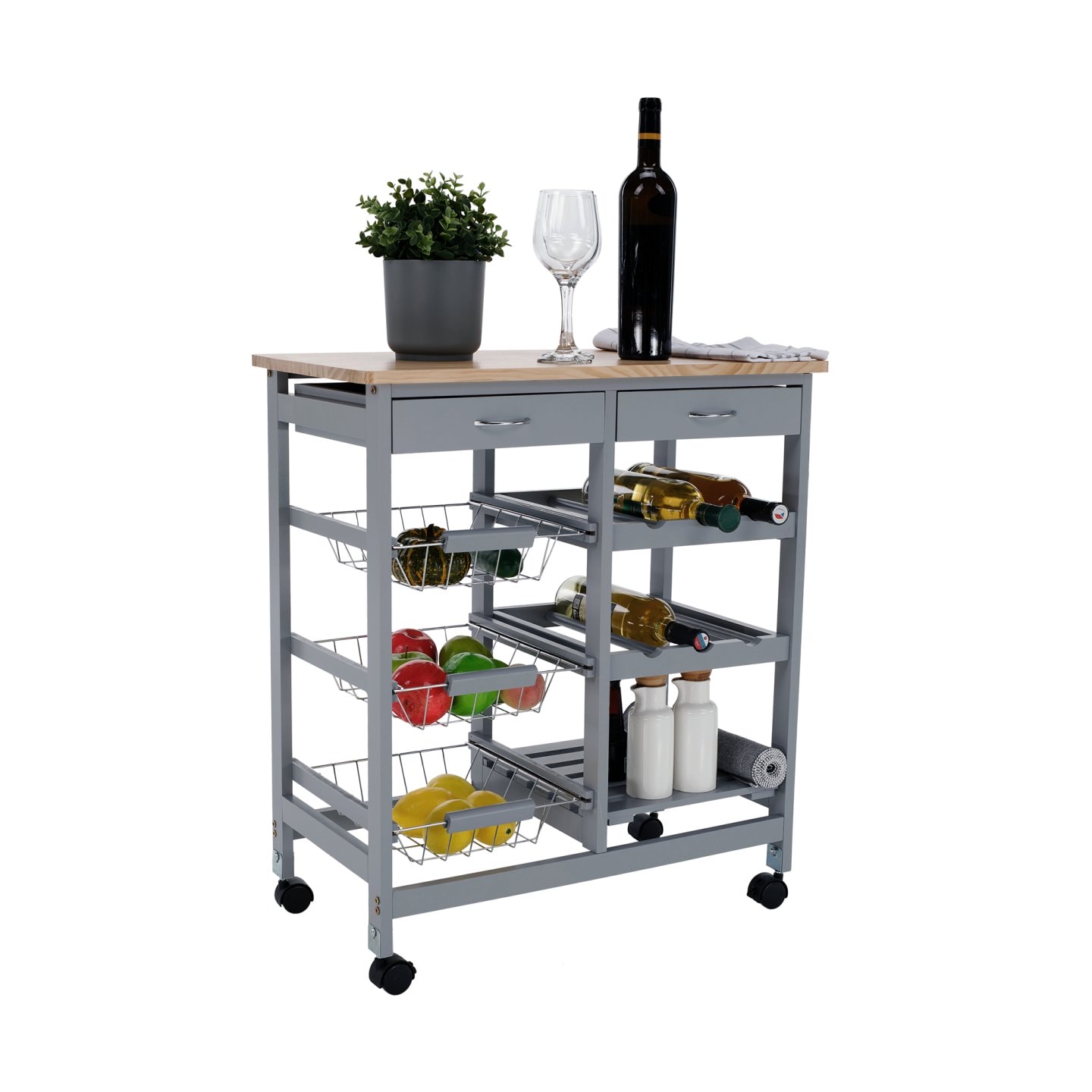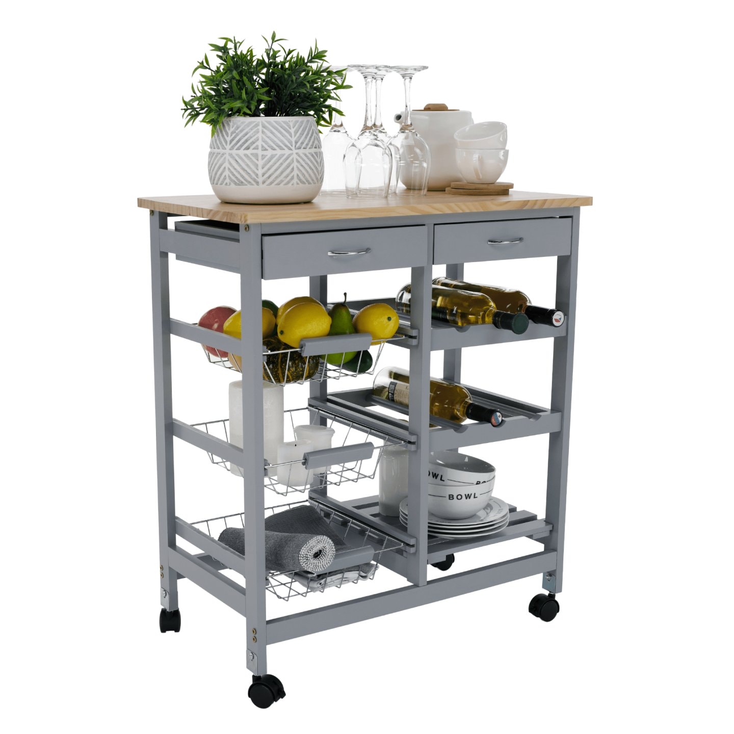 Materiál: MDF/kov/plast Barva: šedá/plát přírodní borovice Rozměry (ŠxHxV): 67x37x76 cm Nosnost: 10kg/police 2 kolečka s brzdami 2 zásuvky 2 poličky na láhve Spodní police 3 výsuvné košíky Multifunkční pomocník Dodáváno v demontu