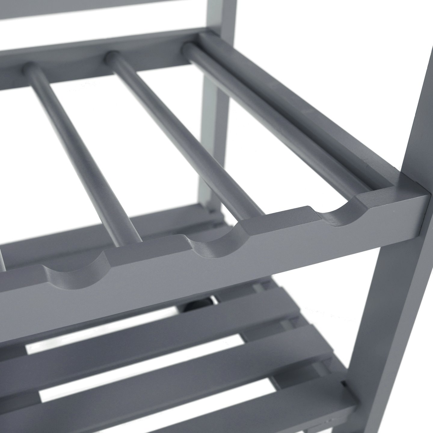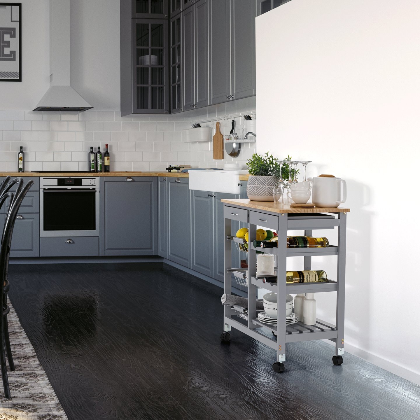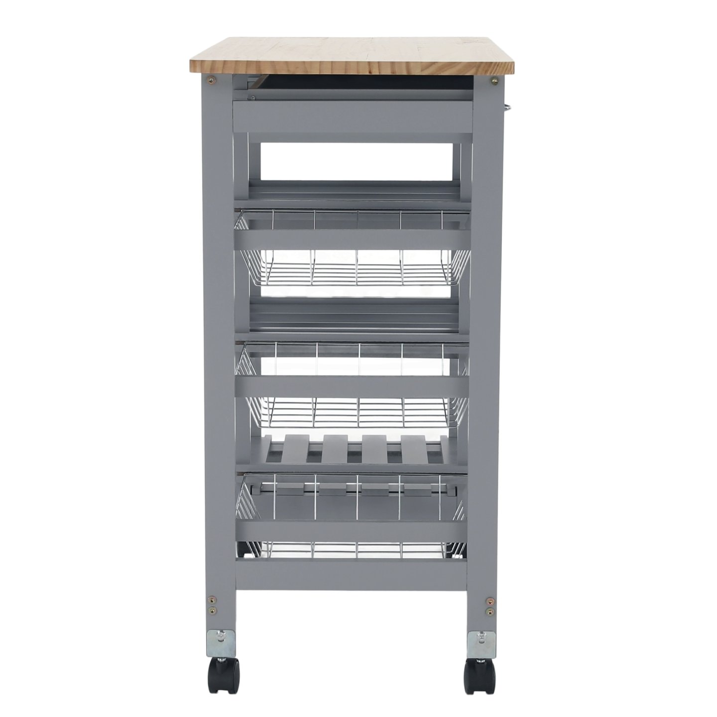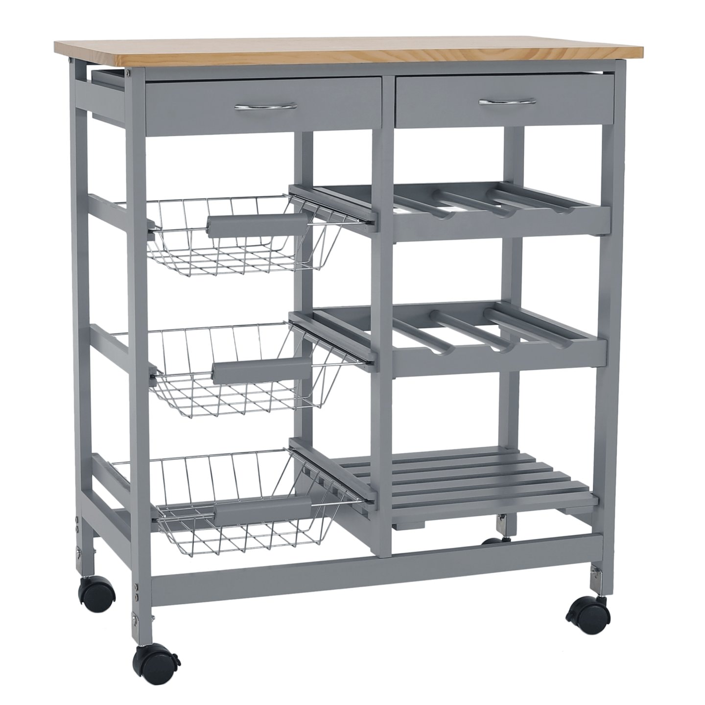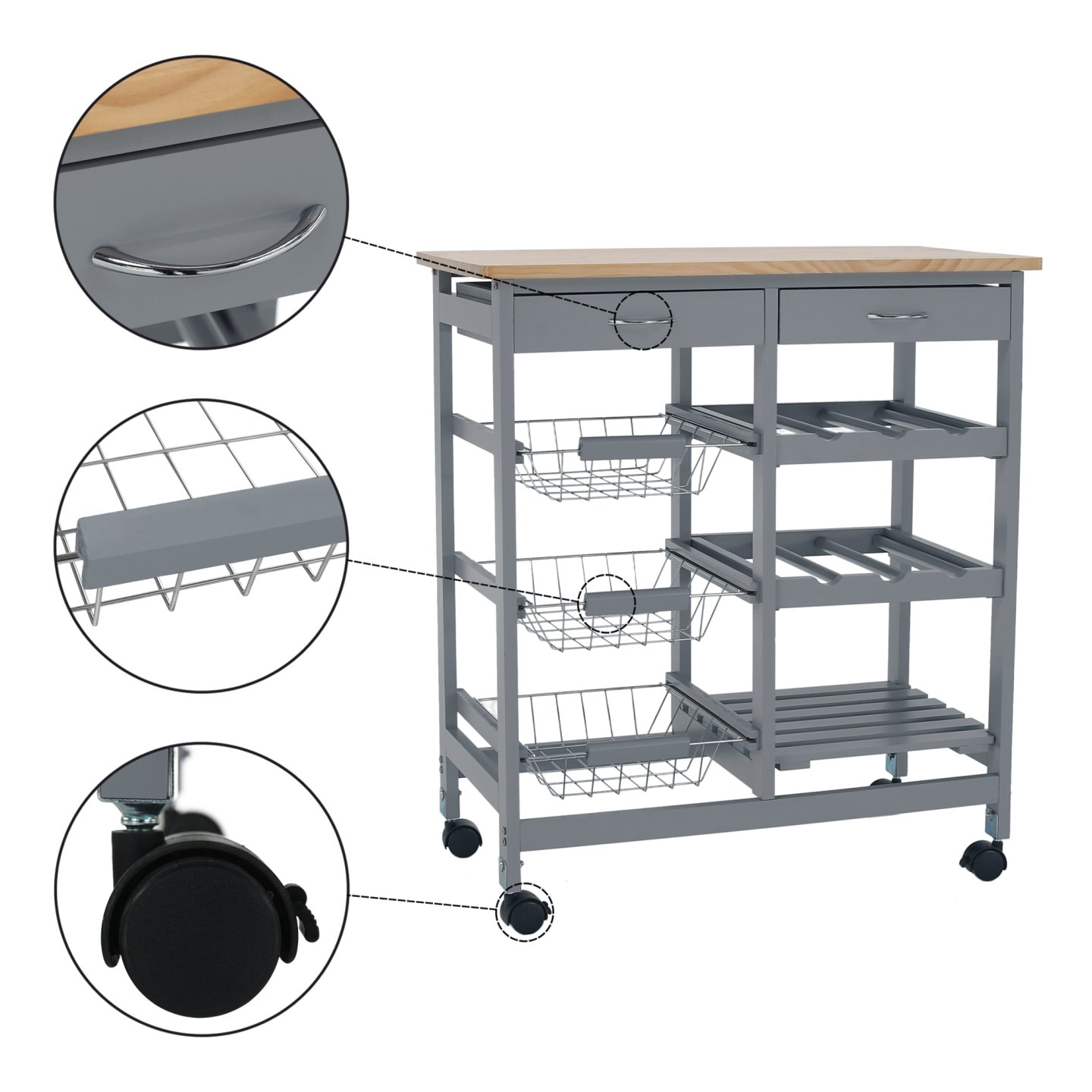 Materiál: MDF/kov/plast Barva: šedá/plát přírodní borovice Rozměry (ŠxHxV): 67x37x76 cm Nosnost: 10kg/police 2 kolečka s brzdami 2 zásuvky 2 poličky na láhve Spodní police 3 výsuvné košíky Multifunkční pomocník Dodáváno v demontu