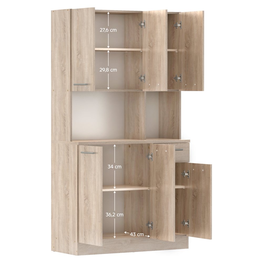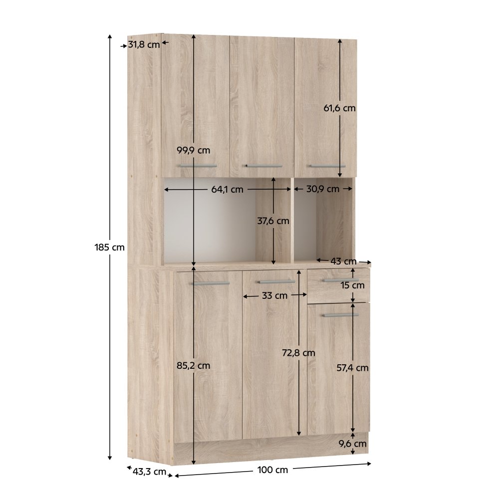 Materiál: DTD laminovaná Barva: dub sonoma Rozměry (ŠxHxV): 100x43,3x185 cm Tloušťka materiálu: 1,6 cm Tloušťka vrchního plátu spodní skříňky: 2,2 cm Šestidveřový Policový Nosnost police: 5 kg 1 zásuvka Rozměry zásuvky (ŠxV): 30,9x15 cm S úchytkami Materiál úchytek: PVC Barva úchytek: stříbrná Na…