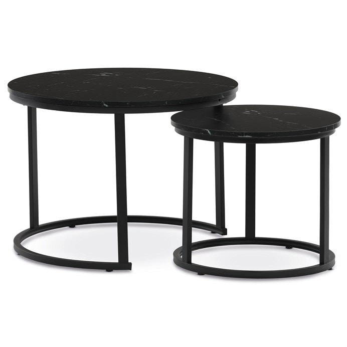 Set dvou konferenčních stolků s deskami z MDF v dekoru černého mramoru a matnou povrchovou úpravou nabízí moderní řešení pro obývací pokoj či kancelář. Kovová podnož v černém laku zajišťuje pevnou a stabilní oporu, zatímco kulatý tvar stolů přispívá k elegantnímu a vzdušnému vzhledu. Větší stolek dosahuje výšky 50 cm, menší je o něco nižší, což umožňuje jejich praktické skládání a variabilní uspořádání prostoru. Kombinace kvalitních materiálů a precizního zpracování zaručuje dlouhou životnost a snadnou údržbu. Tento set je vhodný pro moderní interiéry, kde oceníte funkčnost i design.