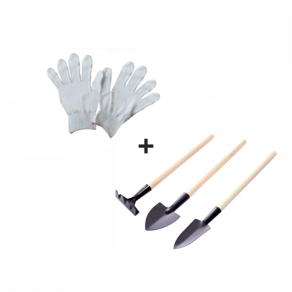 K regálu dostanete jako dárek pár rukavic a set ručního zahradního nářadí sestávajícího ze tří kusů.