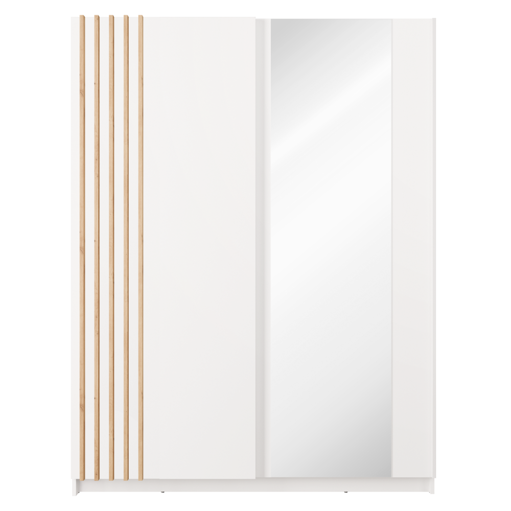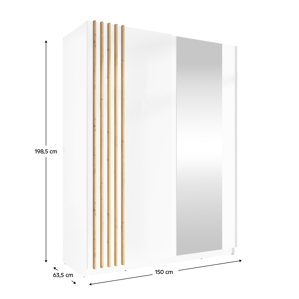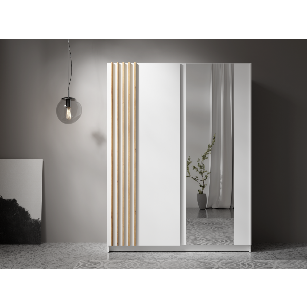 Je vyrobena z laminované DTD a MDF v elegantním bílém provedení s dekorem dub artisan. Design skříně obohacují ozdobné lamely, které jí dodávají jedinečný charakter a moderní vzhled. Zrcadlo umístěné na dveřích nejen usnadňuje každodenní výběr outfitu, ale zároveň přidává nábytku nádech luxusu a opticky zvětšuje prostor. Skříň nabízí kombinaci policové a věšákové části, díky čemuž poskytuje dostatek místa pro přehledné uložení oblečení, doplňků a dalších předmětů. Posuvné dveře zajišťují pohodlnou manipulaci a zároveň šetří prostor v místnosti.