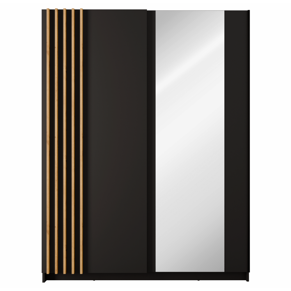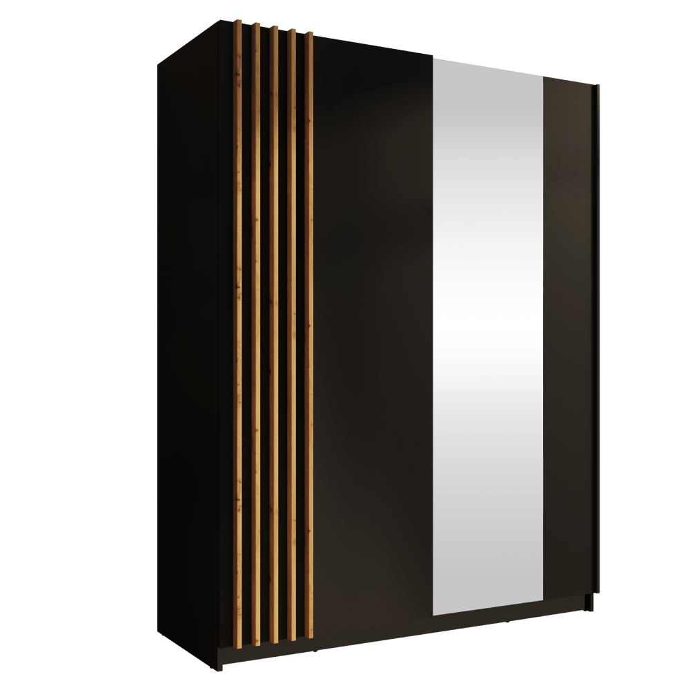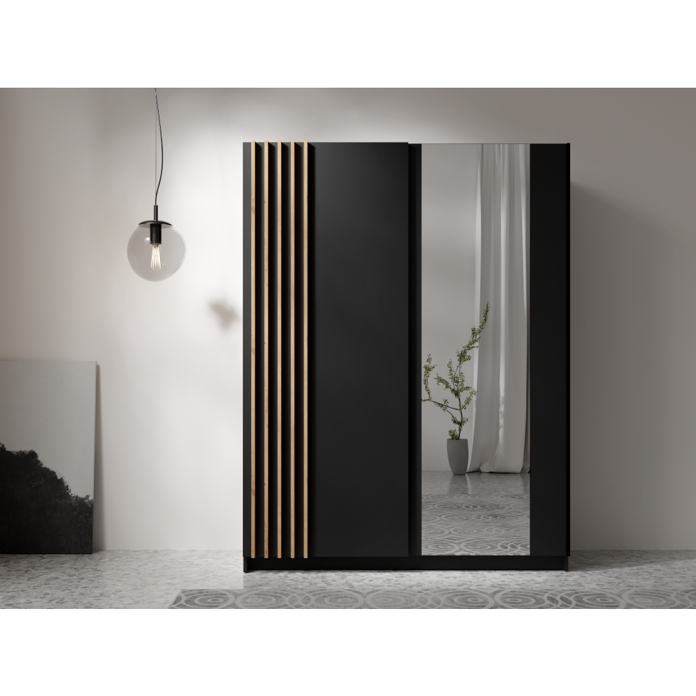 Je vyrobena z laminované DTD a MDF v elegantním černém provedení s dekorem dub artisan. Design skříně obohacují ozdobné lamely, které jí dodávají jedinečný charakter a moderní vzhled. Zrcadlo umístěné na dveřích nejen usnadňuje každodenní výběr outfitu, ale zároveň přidává nábytku nádech luxusu a opticky zvětšuje prostor. Skříň nabízí kombinaci policové a věšákové části, díky čemuž poskytuje dostatek místa pro přehledné uložení oblečení, doplňků a dalších předmětů. Posuvné dveře zajišťují pohodlnou manipulaci a zároveň šetří prostor v místnosti.