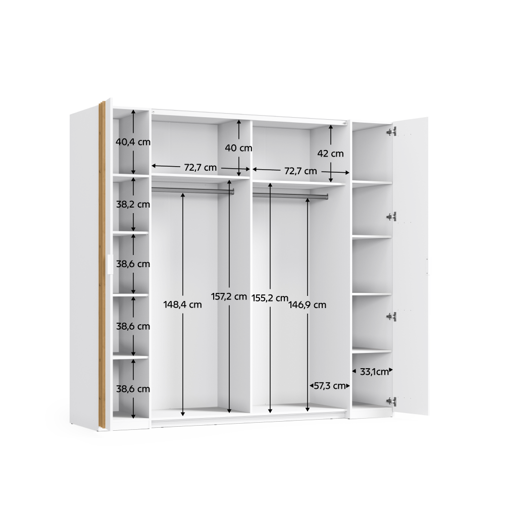 Materiál: DTD laminovaná/MDF/ABS hrany/sklo Barva: bílá/dub artisan Rozměry (ŠxHxV): 218x62x207,5 cm Tloušťka materiálu: 1,6 cm Tloušťka zrcadla: 0,3 cm S úchytkami Ozdobné lamely Se zrcadlem Čtyřdveřová 2x posuvné dveře 2x klasické dveře 2x Věšáková tyč Policová část Nosnost police: 5 kg Nosnost…
