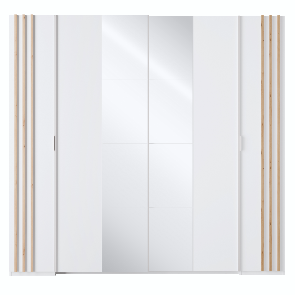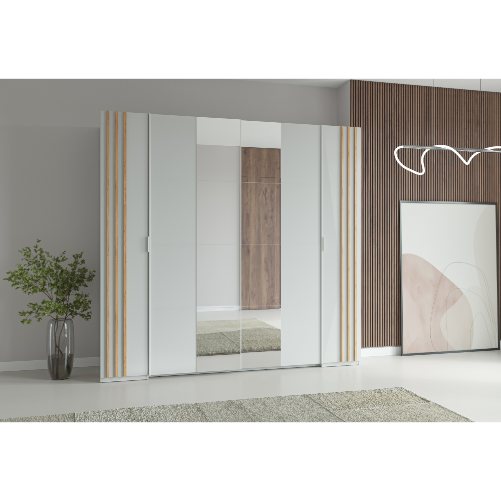 Moderní čtyřdveřová skříň 2D FLORENS nabízí praktické řešení úložného prostoru. Obsahuje policovou část, dvě věšákové tyče a kombinaci klasických a posuvných dveří se zrcadlem.