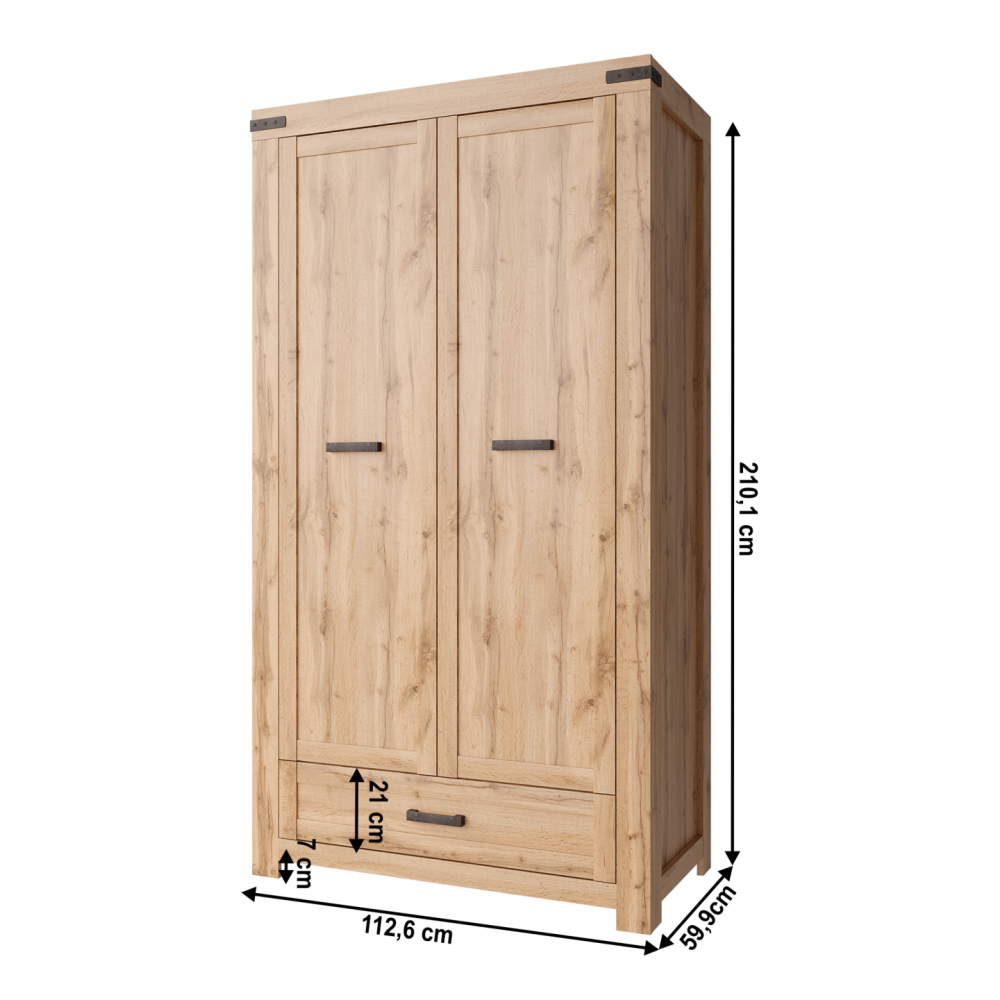 Materiál: DTD laminovaná/MDF/plast Barva: dub wotan Rozměry (ŠxHxV): 112,6x59,9x210,1 cm Výška nožiček 7 cm Tloušťka materiálu: 1,6 - 2,2 cm Kombinovaná Dvoudveřová Jedna skříňka Ve skříňce je věšáková tyč a police Jeden šuplík Výška šuplíků: 21 cm Plastový dekor a úchytky MDF dvířka Dodávána v…