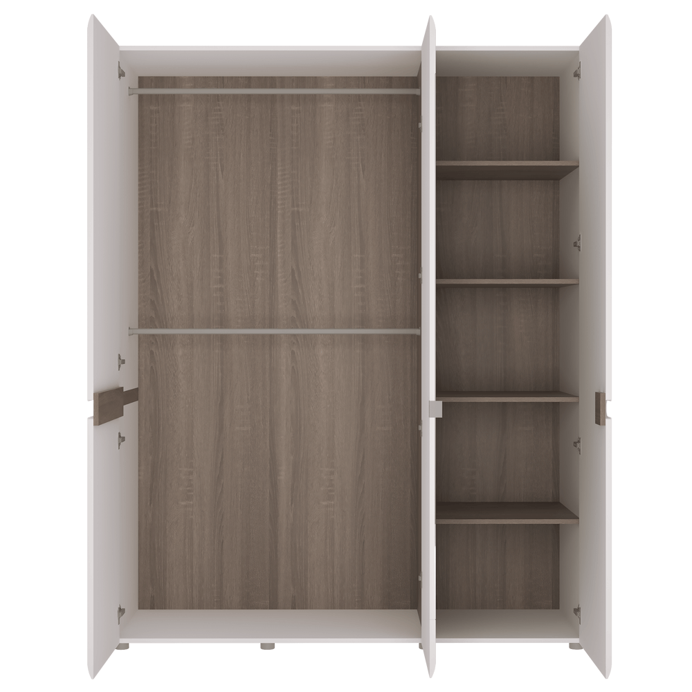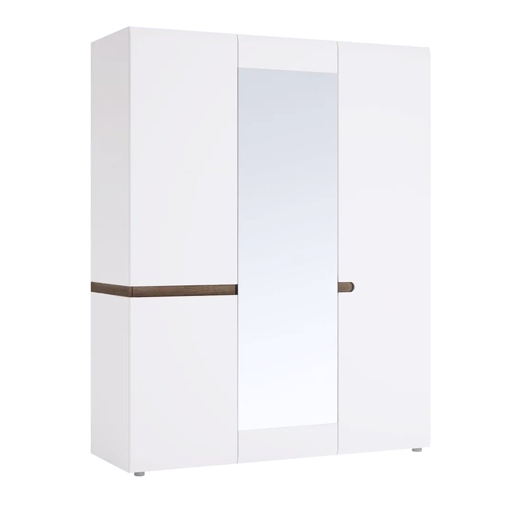 Třídveřová skříň LYNATET 22 Provedení: bílá extra vysoký lesk HG / dub sonoma truflový Materiál: DTD laminovaná Moderní zaoblené hrany. Rozměry (ŠxHxV): 164x59x209 cm. Tloušťka materiálu: 16 mm Korpus je v matném provedení Dvířka jsou v provedení extra vysoký lesk Dodávané v demontu.