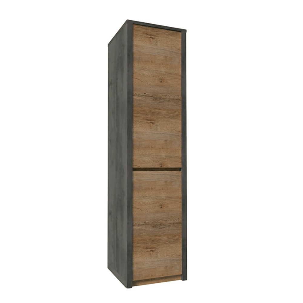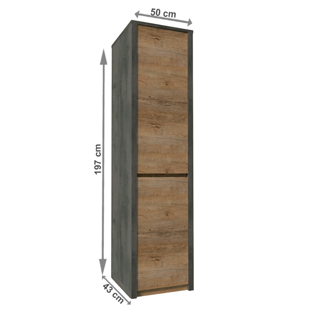 Skříň S1D, MONTANA Materiál: DTD laminovaná, ABS hrany Barevné provedení: dub lefkas tmavý / smooth šedý Rozměry (ŠxHxV): 50x43x197 cm Tloušťka materiálu: 15 mm Dodávané v demontu.