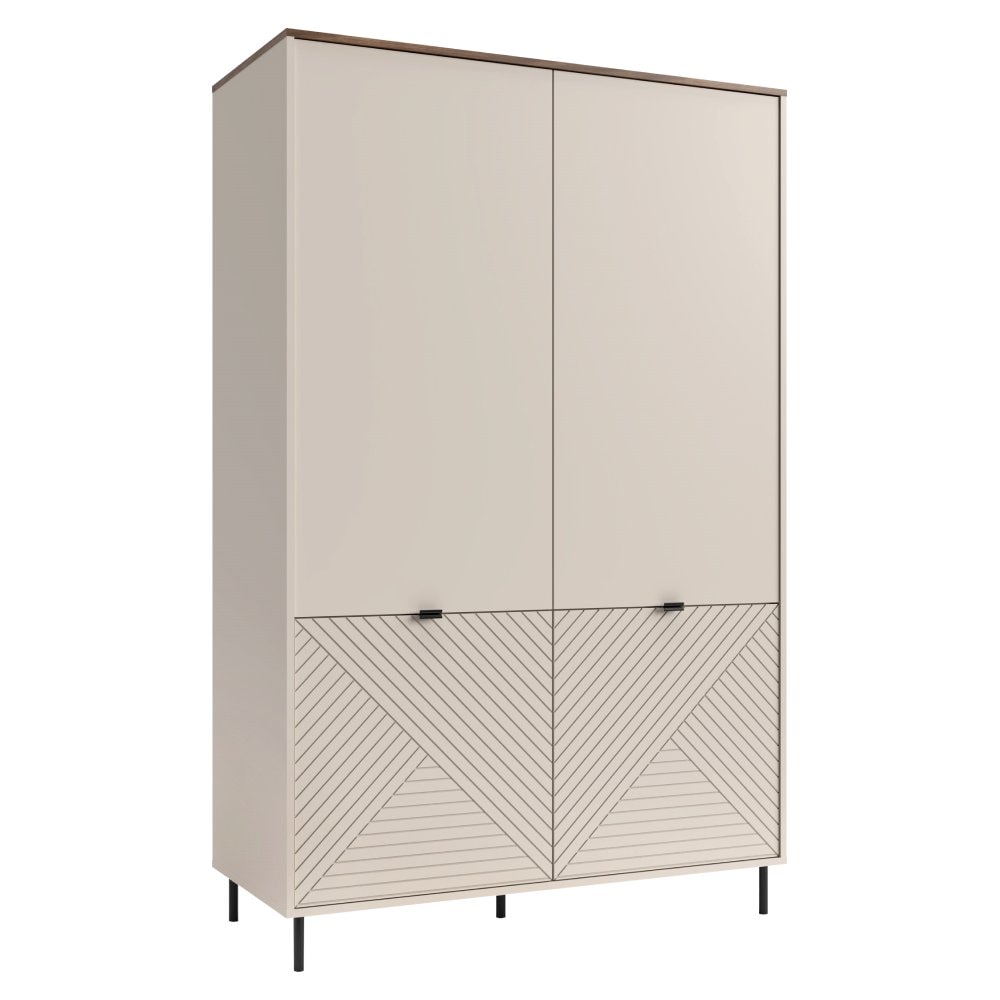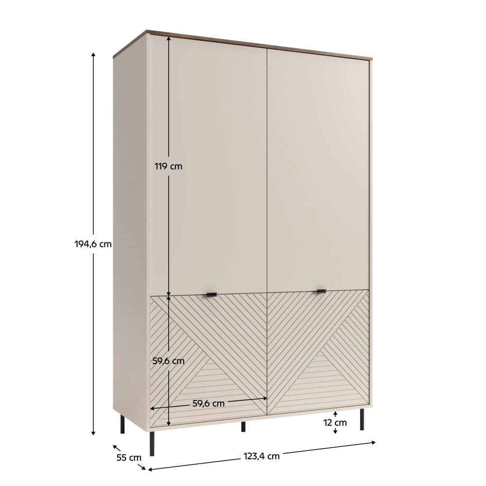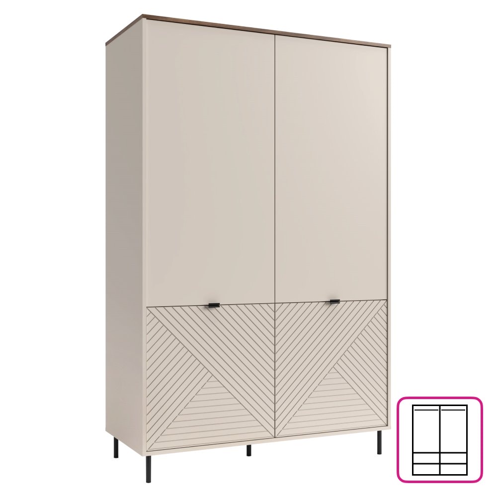 Materiál: laminovaná DTD/fóliovaná MDF/ABS hrany Barva: kašmír/dub castello Rozměry (ŠxHxV): 123,2x55x194,6 cm Tloušťka materiálu: 1,6 cm Čtyřdveřová 2x věšáková tyč Policová S úchytkami Materiál úchytek: kov Barva úchytek: černá Na nožičkách Materiál nožiček: kov Barva nožiček: černá Výška nožiček…