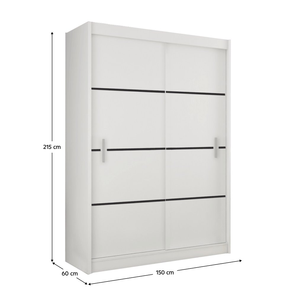 Skříň s dvěma posuvnými dveřmi Merina Barevné provedení: černá / bílá Materiál: DTD laminovaná, Rozměry (ŠxHxV): 150x60x215 cm Tloušťka materiálu: 16 mm Nosnost police: 5 kg Nosnost věšáku: 5 kg Není vhodné zatěžovat vrchní desku Dodávána v demontu