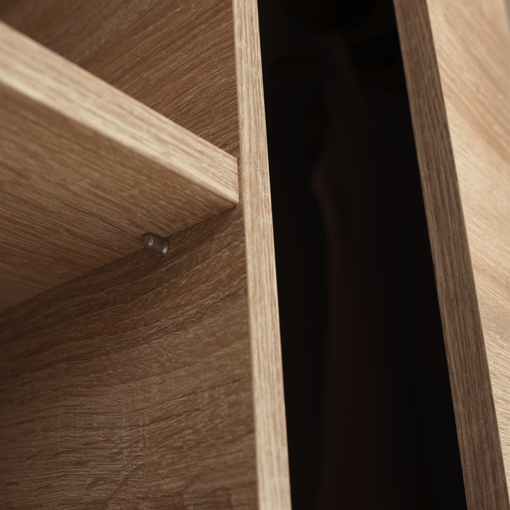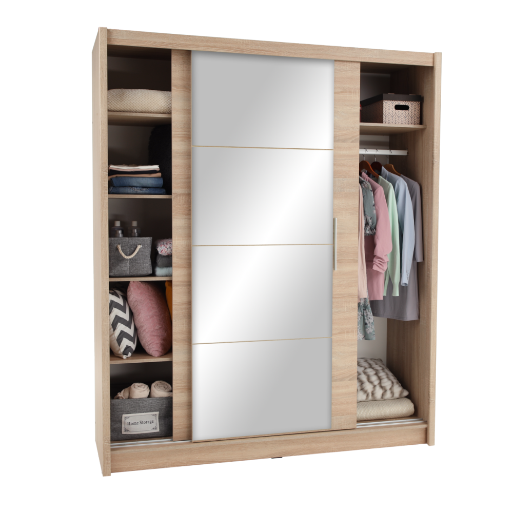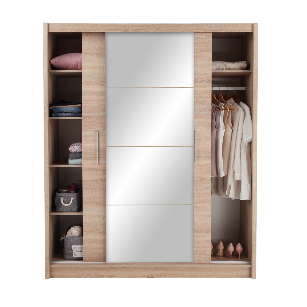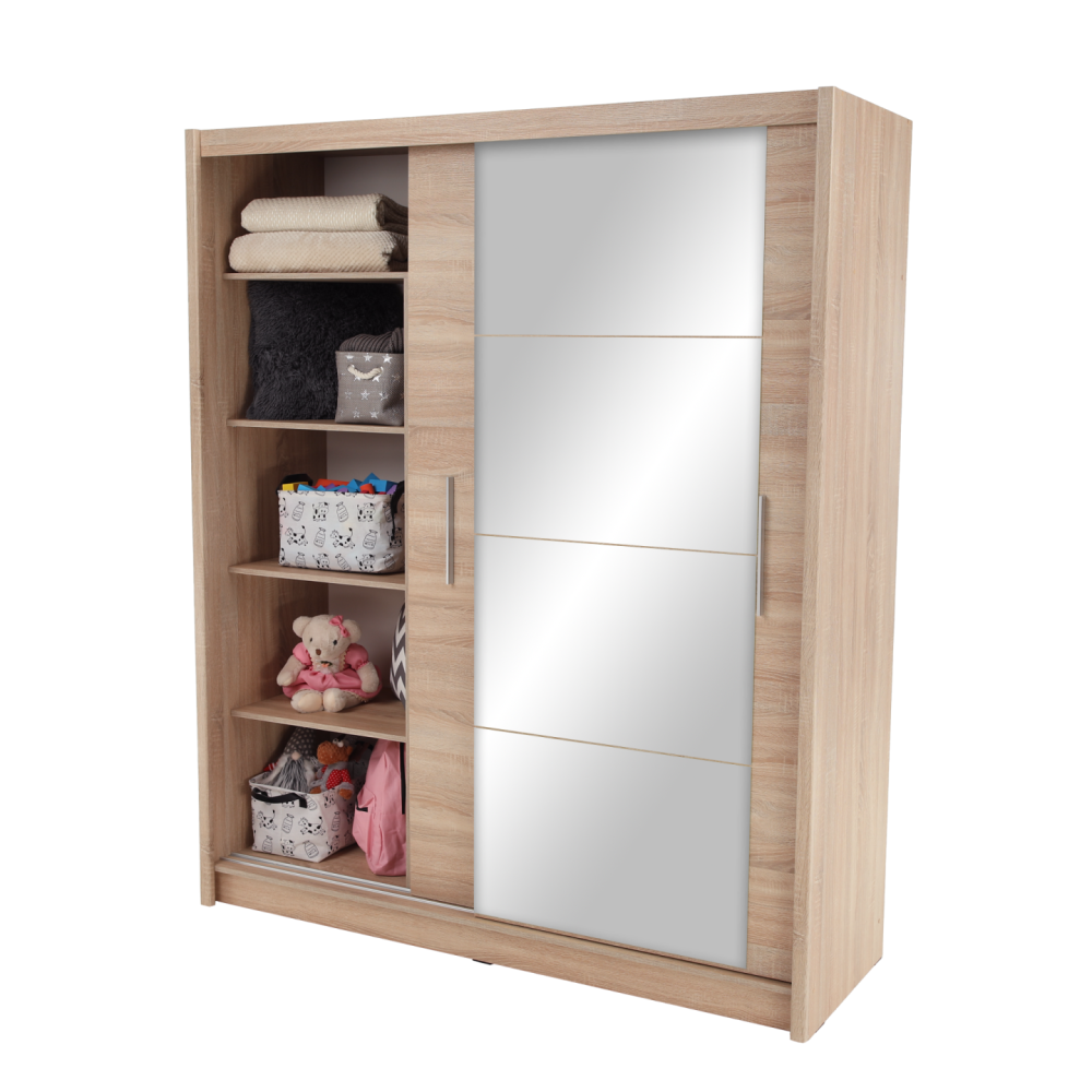My vám nabízíme řešení. Skříň s posuvnými dveřmi Low je moderní věšáková skříň která se hodí do každého prostoru a stane se dominantou vašeho pokoje. Oceníte ji hlavně v malém pokoji, protože dveře skříně jsou posuvné a při otevírání nezasahují do prostoru. V jedné části jsou police, které poskytují spoustu prostoru pro vaše oblečení. Druhou stranu tvoří věšáková tyč. Skříň je vyrobena z kvalitní laminované dřevotřísky v provedení dub sonoma. Bonusem je krásně velké zrcadlo, které dodává skříni nádech luxusu. Skříň s posuvnými dveřmi Low opticky zvětší váš pokoj a stane se elegantním a designovým prvkemkaždé místnosti do které se ji rozhodnete dát.