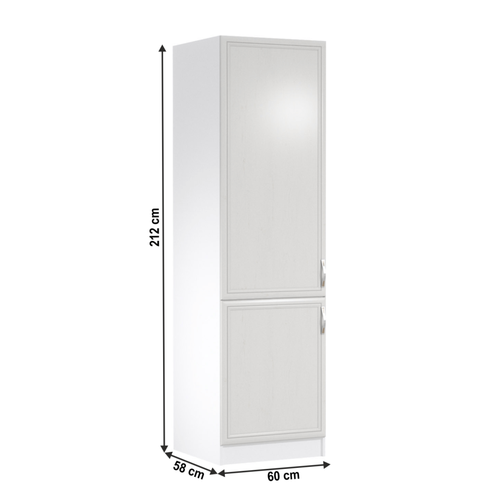 Skříň D60ZL je rozdělena na dvě části se dvěma dvířky. Dvířka se otevírají pomocí kovových úchytů. Pravé provedení s otevíráním dveří do pravé strany. Skříňka je předpřipravená na vestavnou lednici. Rustikálně působící lišty jsou z kvalitní MDF.