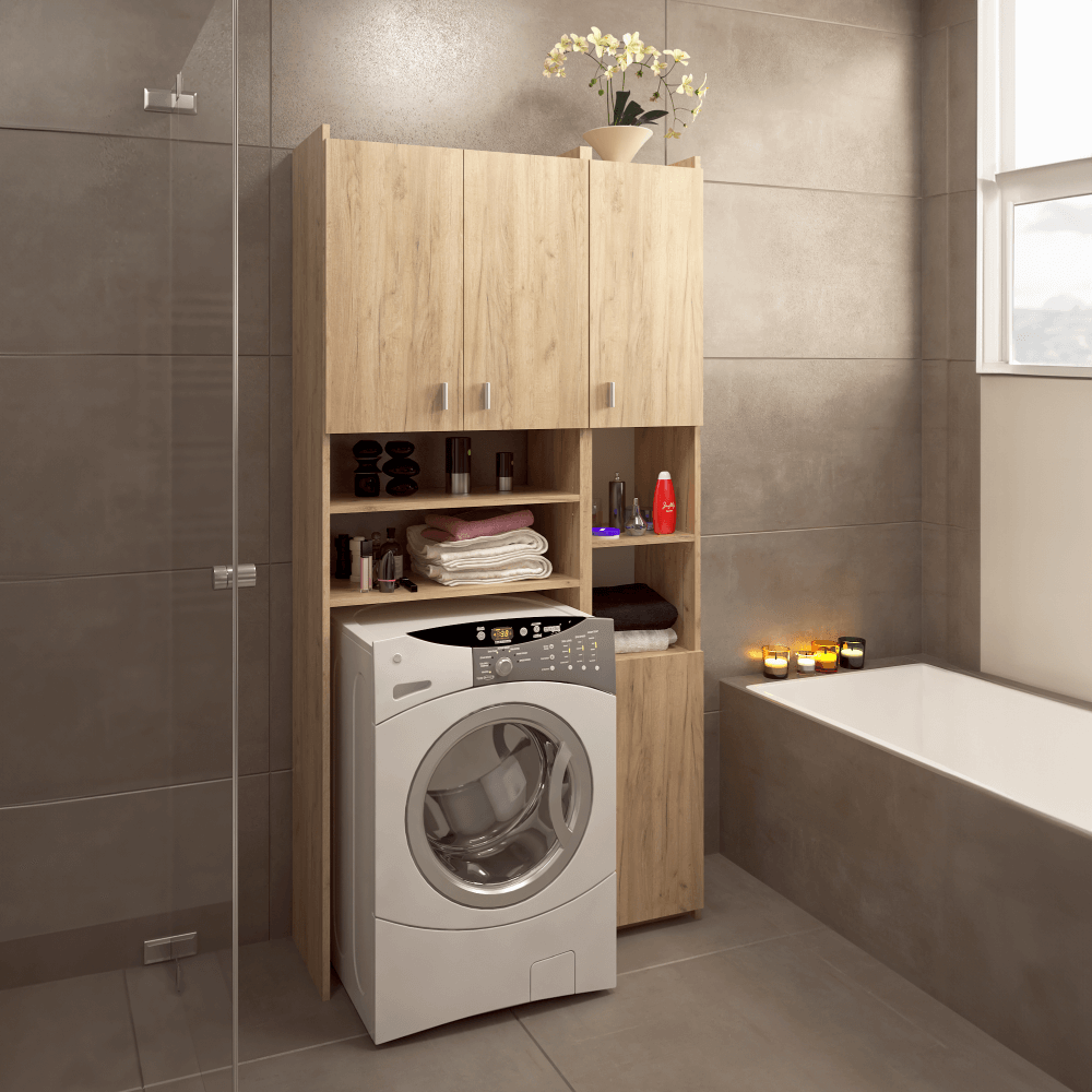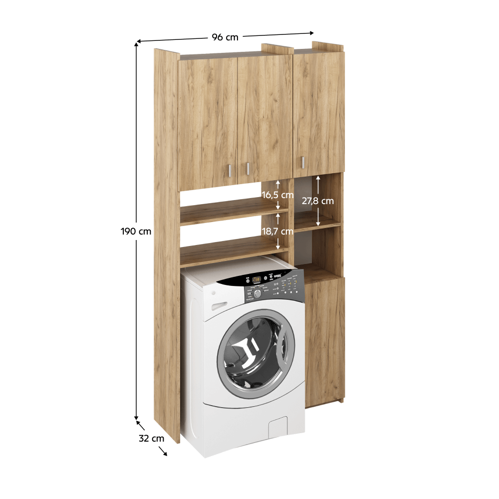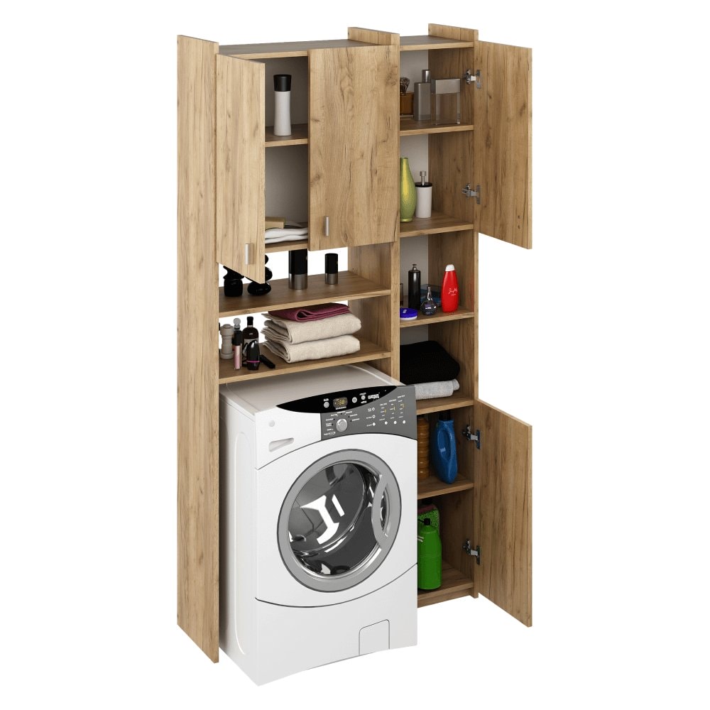 Skříňka nad pračku MIRALI je praktickým řešením pro udržení pořádku a využití prostoru v koupelně. Poskytuje dostatek úložného prostoru pro koupelnové doplňky, čistící prostředky nebo ručníky. Vyrobena je z laminované dřevotřísky v provedení dub artisan. Sestává z otevřeného úložného prostoru, který je určen pro pračku s maximálními rozměry 60,8x85 cm. Nad skříňkou na pračku se nachází dvoudveřová skříňka předělená policí na dvě části. Součástí skříňky je regál, který disponuje dvěma skříňkami v horní a dolní části. Ve středu naleznete otevřený úložný prostor. Regál je univerzální, umíte jej umístit na pravou nebo levou stranu. Skříňka MIRALI je postavena na kluzácích. Manipulaci s dvířky usnadňují plastové úchytky.