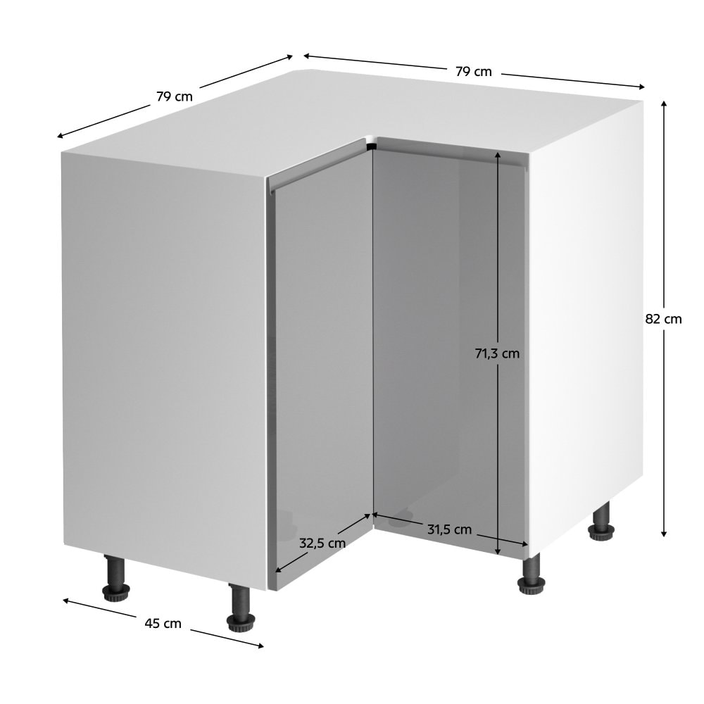 Spodní rohová skříňka D90N je s dvířky. Dvířka se otevírají bez úchytky. Vnitřní prostor je policí rozdělen na dvě odkládací plochy.