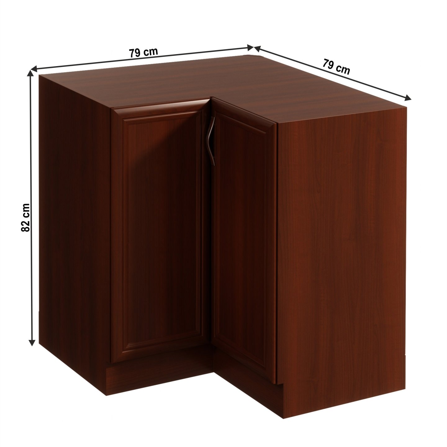 Dolní rohová skříňka D90N je s dvířky. Dvířka se otevírají pomocí kovové úchytky. Vnitní prostor je policí rozdělen na dvě odkládací plochy. Rustikálně působící lišty jsou z kvalitní MDF.